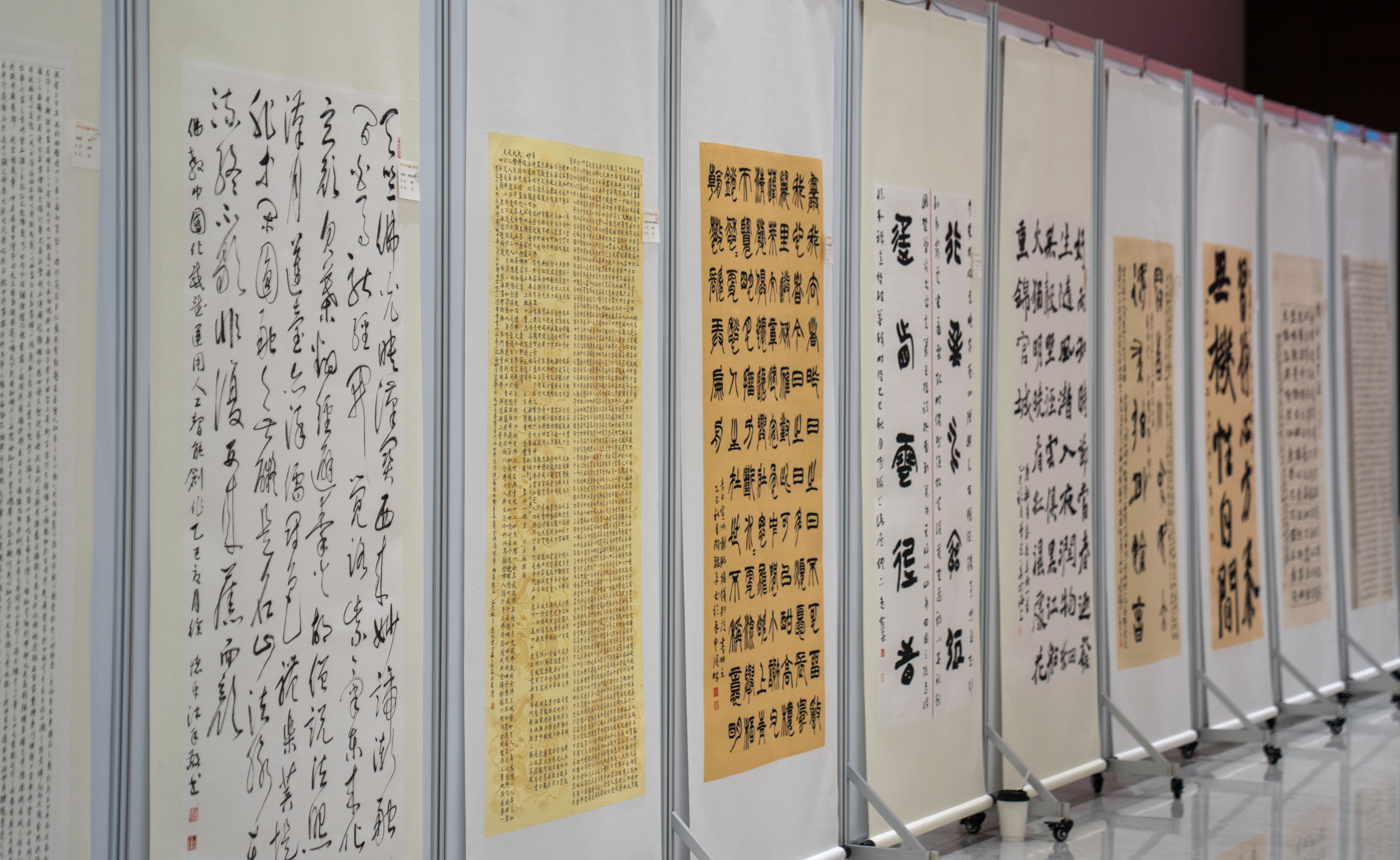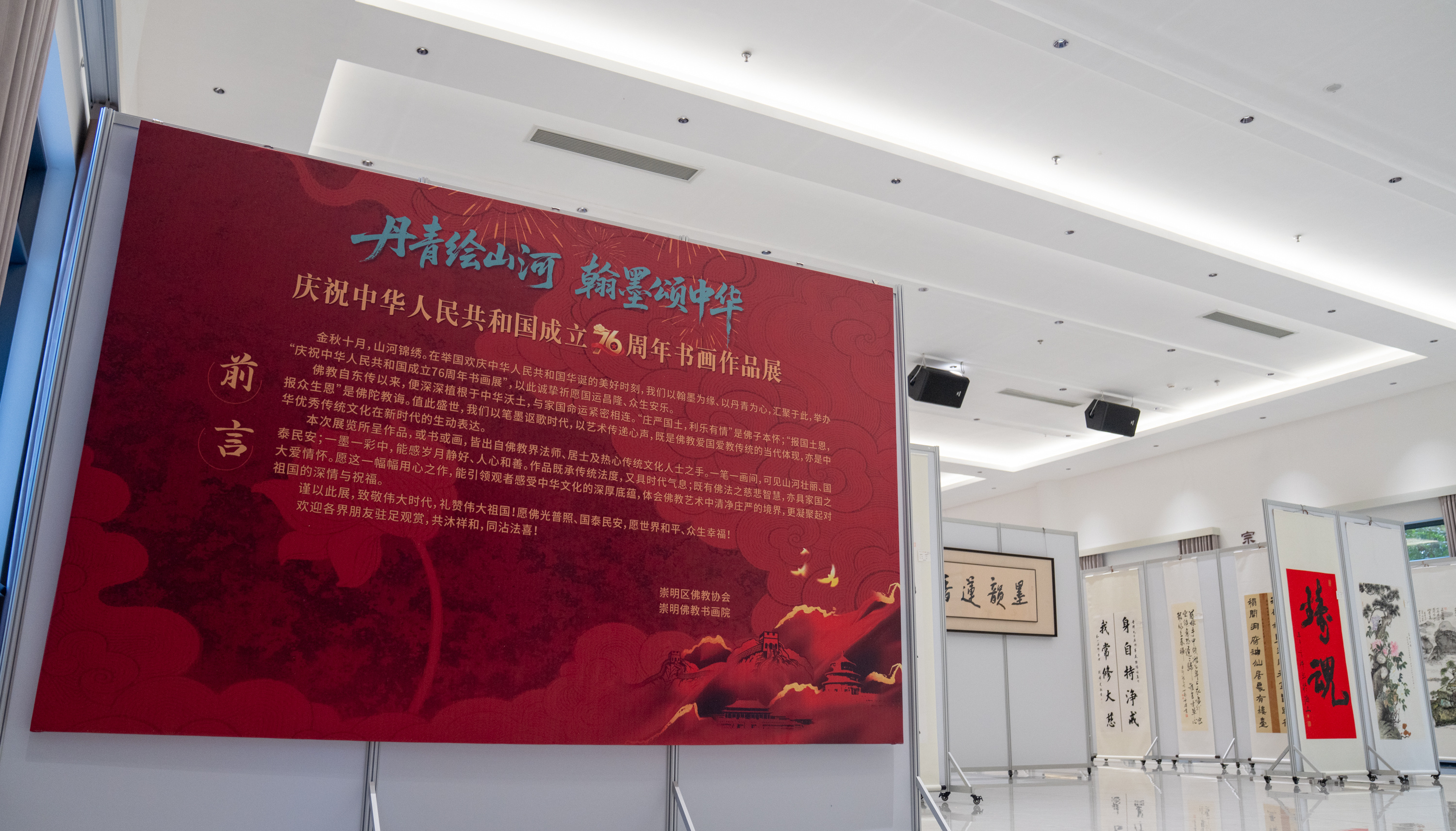 9月26日上午,为庆祝中华人民共和国成立76周年,弘扬中华优秀传统文化,“丹青绘山河·翰墨颂中华——庆祝中华人民共和国成立76周年书画作品展”在崇明寿安寺·金鳌山景区半山讲堂开展。