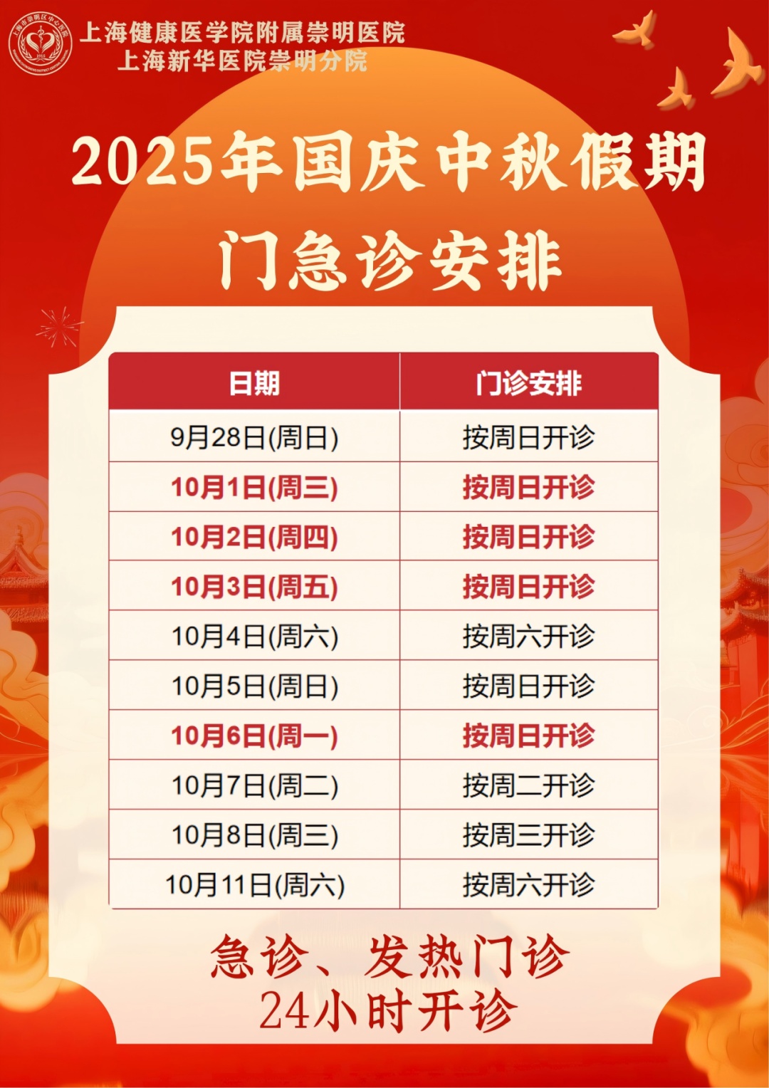 上海健康医学院附属崇明医院国庆中秋假期门急诊安排