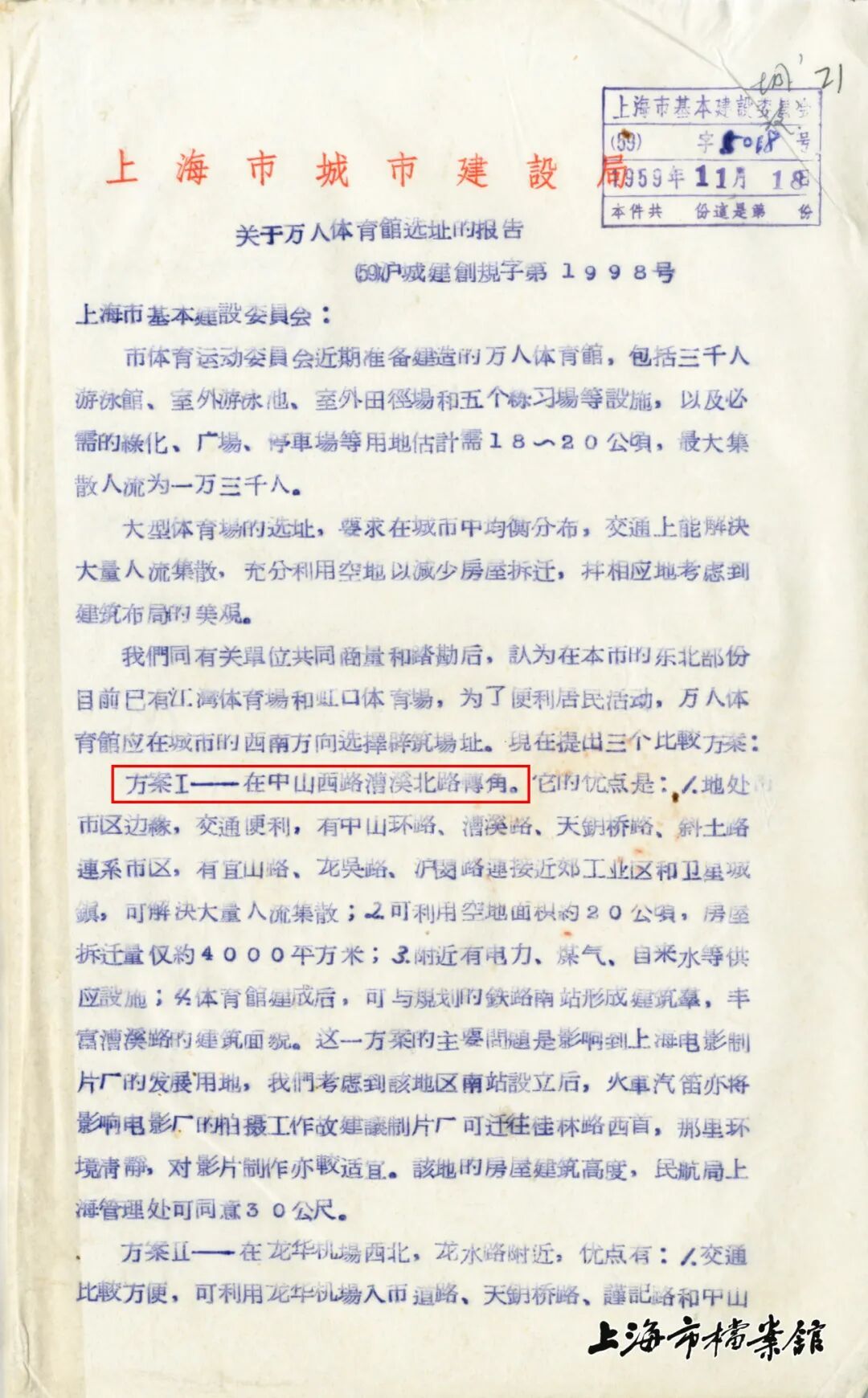 至于“万体馆”选择在哪里建造,在中共上海市委指定由市基本建设委员会开展的后续选址考察中,市建委根据市城市建设局的建议,提出了四个比选方案。后经反复比较,中山西路漕溪北路转角处,因具有交通便利、可利用空地面积大且房屋拆迁量小、附近有电力和自来水等供应设施等突出优势,在多个选址方案中脱颖而出。