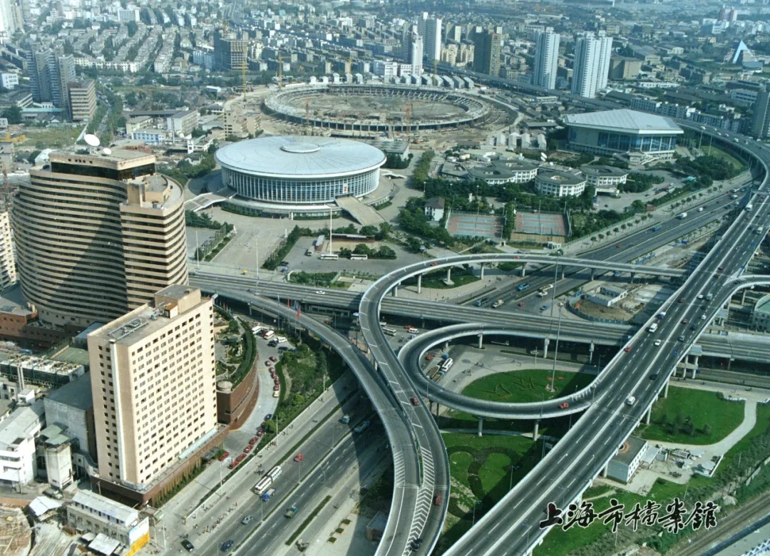 1990年代中期“万体馆”鸟瞰,不远处的上海体育场正在建设中(上海市档案馆藏)