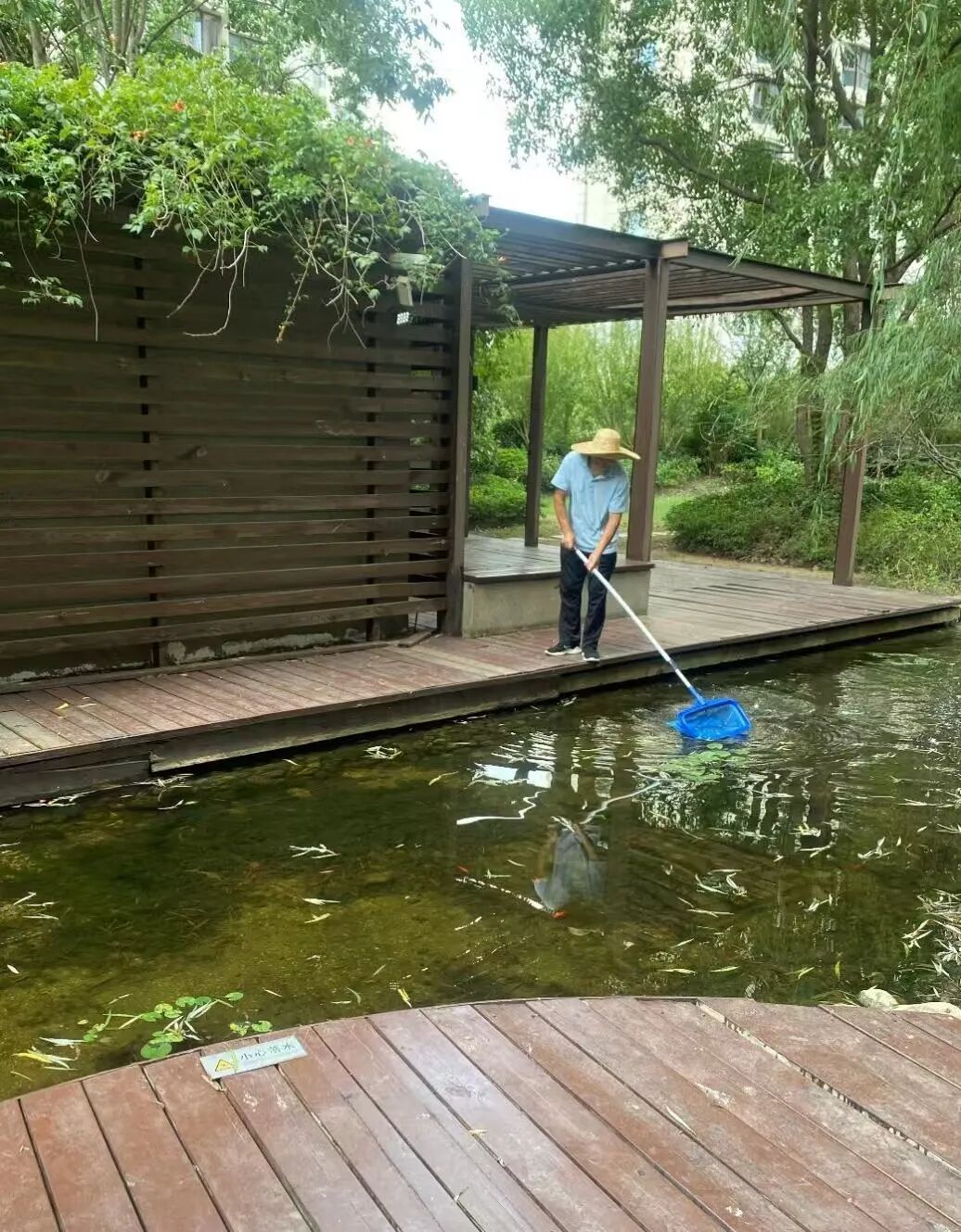 长风名苑物业正在清理景观水系的杂物