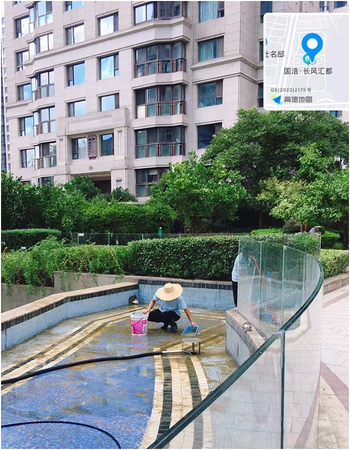 长风名苑物业正在清洗景观水池