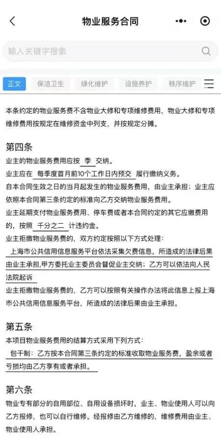 业主只需点击首页“热门服务”→“物业服务合同”即可便捷查看自己居住小区的物业服务合同条款、内容,了解企业承诺的服务内容和标准、双方权利义务等内容,还可通过关键词搜索定位功能,快速、精准地查阅到所需的合同相关信息。(2023年6月前签订的合同暂不支持关键词搜索)