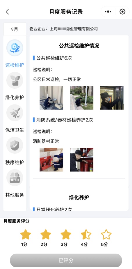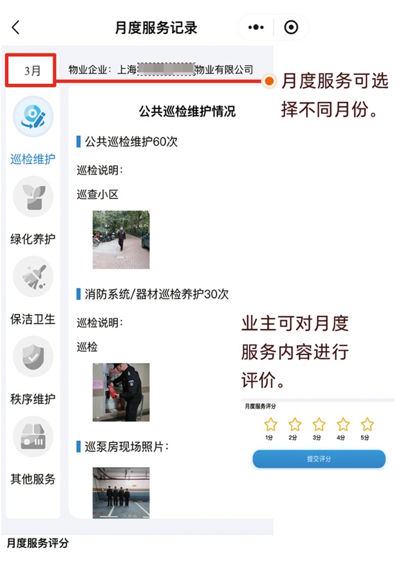 自从“上海物业”小程序有了“月度服务记录”板块后,上述问题得到了一定改善。在这个官方小程序上,物业的各项工作总结、当月完成的各项服务记录(如公共巡检维护、消防器材巡检、保洁卫生、绿化养护、秩序巡逻维护、其他工作情况等),都进行系统化展示,业主也更深入地了解到物业每天、每月都在做什么。“作为物业经理,我们欢迎业主走进物业,提出合理化建议,我们尽可能满足业主需求,提升业主满意度。”他说。