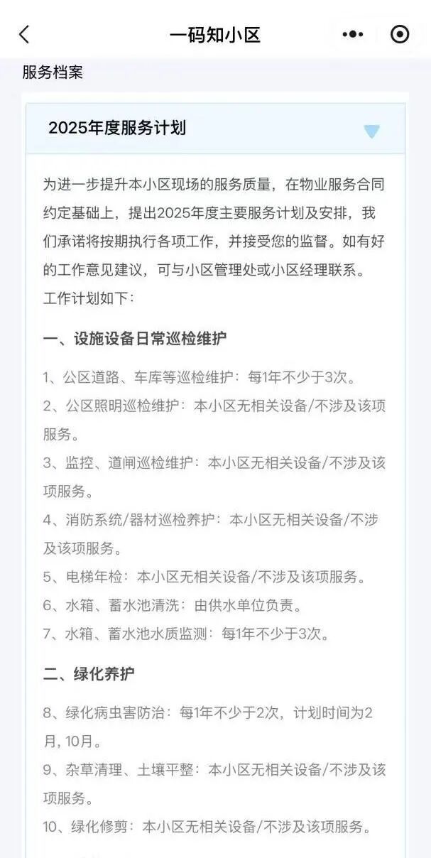 业主绑定住址后,只需点击首页“物业信息查询”即可便捷获知小区物业服务年度计划,了解物业服务企业在巡检维护、绿化养护、保洁卫生、秩序维护等方面的服务内容及服务频次的年度计划。