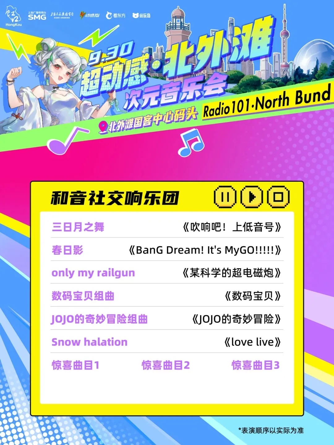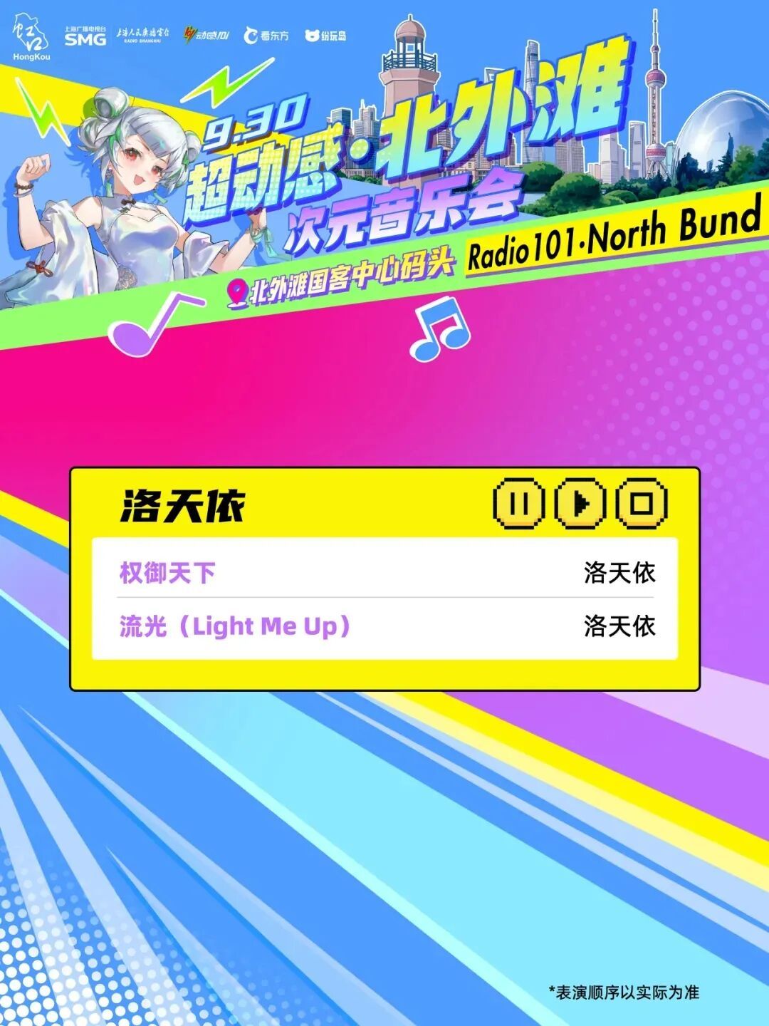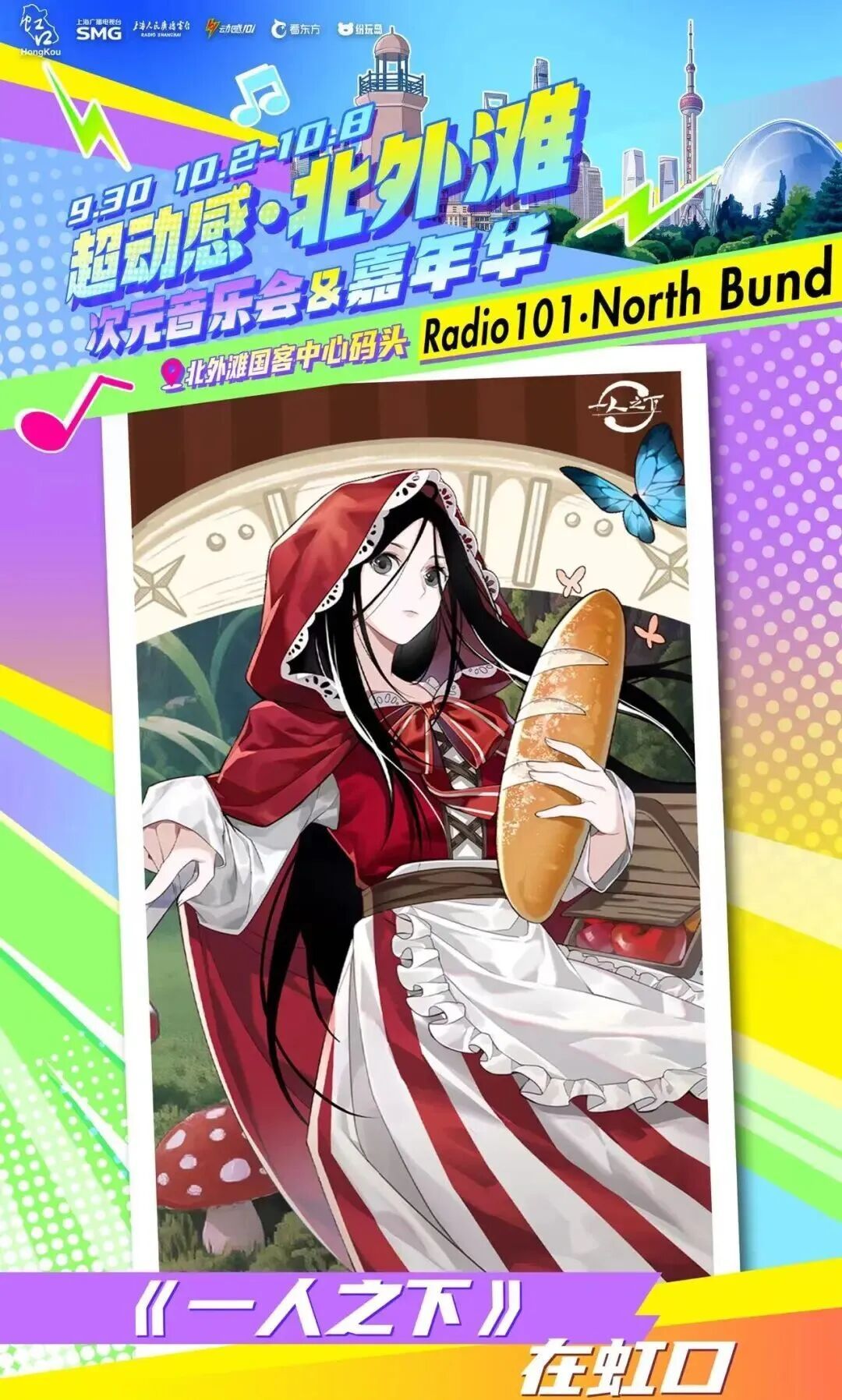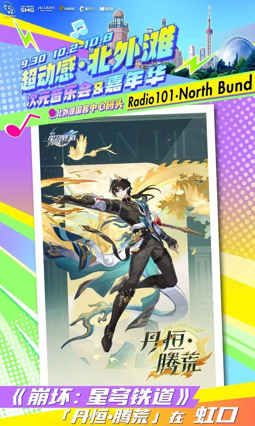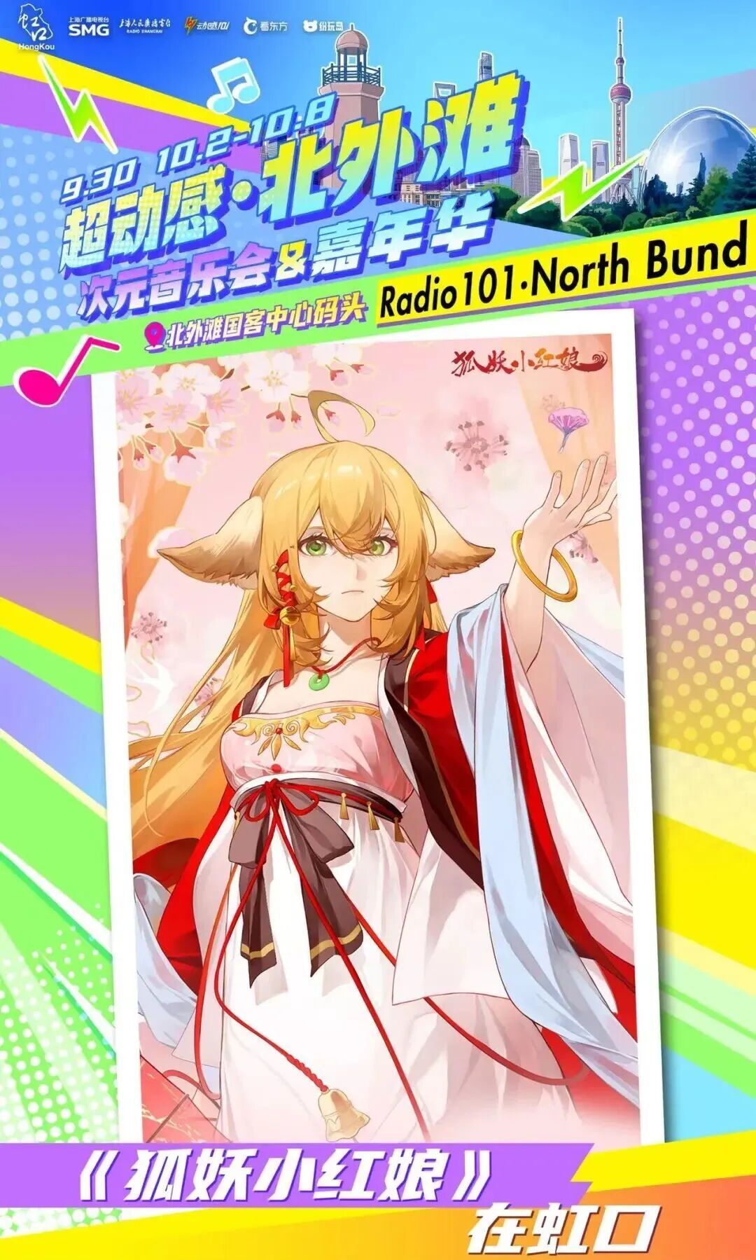 由上海广播电视台、虹口区委宣传部主办,虹口区文化和旅游局、上海人民广播电台动感101承办的“超动感·北外滩次元音乐会”将于9月30日上演。音乐会集合了十余个动漫、游戏IP,每个IP都带来了限定展陈或限量礼品。活动当天,现场还将有创意市集全程开放,近百个摊位汇集了众多二次元周边以及手工匠人精心打造的创意物品!千万不要错过哦~ 10月2日至8日,可通过“Radio生活家”或“看东方”微信小程序购票~还可以通过阿基米德app、“阿基米德米仓”微信小程序预约参加次元音乐嘉年华游园活动。 (微信小程序搜一搜“SMG看东方”进入) 打开“SMG看东方”小程序,点击首页banner图,进入“超动感·北外滩次元音乐会”专区了解更多活动及售票信息。 (“阿基米德米仓”微信小程序) 01 一人之下 《一人之下》将设置“哪都通”快递柜,观众可以现场挑柜门拆“盲盒”。 02 全职高手 《全职高手》将以“荣耀十年”为主题,特设国风剪纸艺术装置墙及“荣耀奖杯”打卡区,让每位观众都能沉浸式体验属于自己的顶峰相见“荣耀时刻”。 03 狐妖小红娘 《狐妖小红娘》将打造“狐妖月老办事处”和“相思树”,观众可以现场挂祈愿牌、抽红绳、摇签筒,沉浸式感受《狐妖小红娘》的氛围。 04 崩坏:星穹铁道 人气游戏《崩坏:星穹铁道》将带来丹恒·腾荒主题花灯,来现场即可和超大的丹恒·腾荒花灯装置合影! 05 王者荣耀 即将迎来上线10周年的《王者荣耀》,将以“英雄共赴茶叙,十年温暖相逢”为核心,在黄浦江边打造“下午茶会客厅”! 还有奥特曼、初音未来、名侦探柯南、面包超人 ...... 更多IP玩法等你现场解锁 豪华原声歌单 全程跟唱! 来源:上海发布 编辑:孙洁静