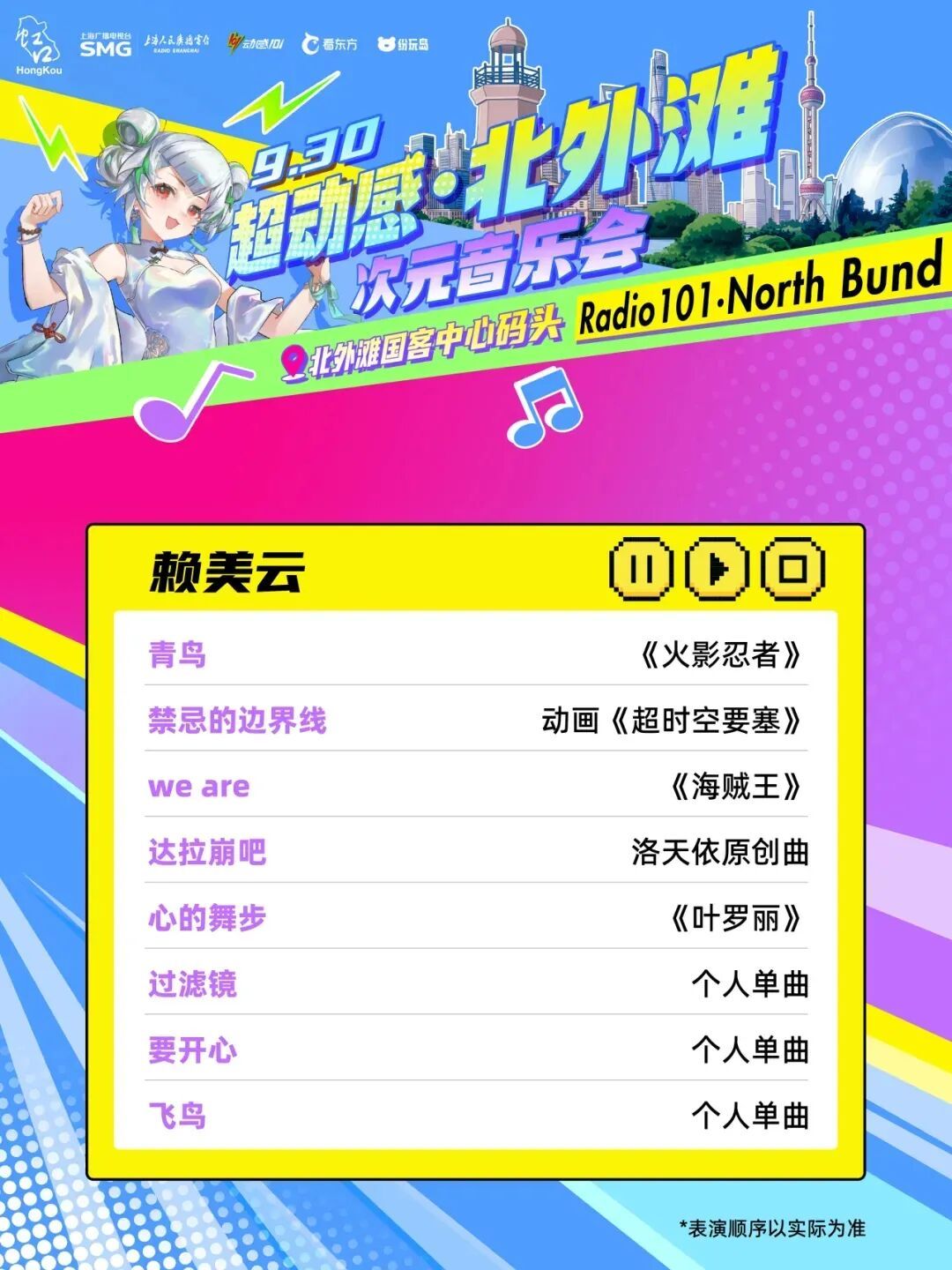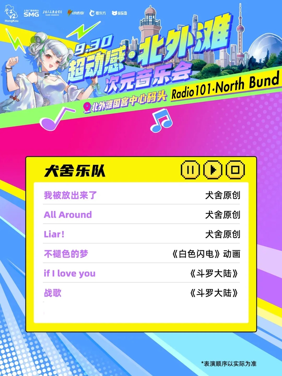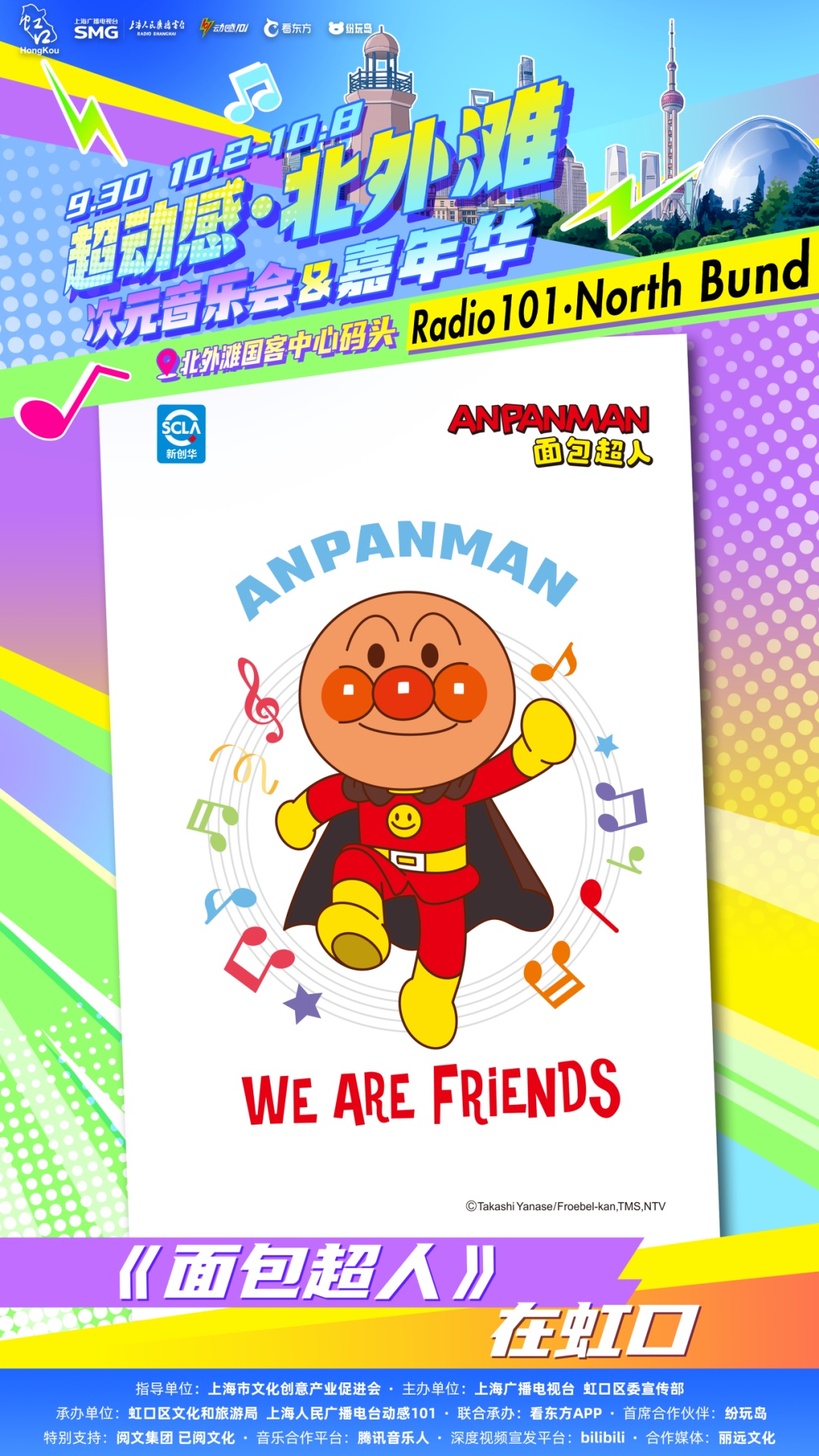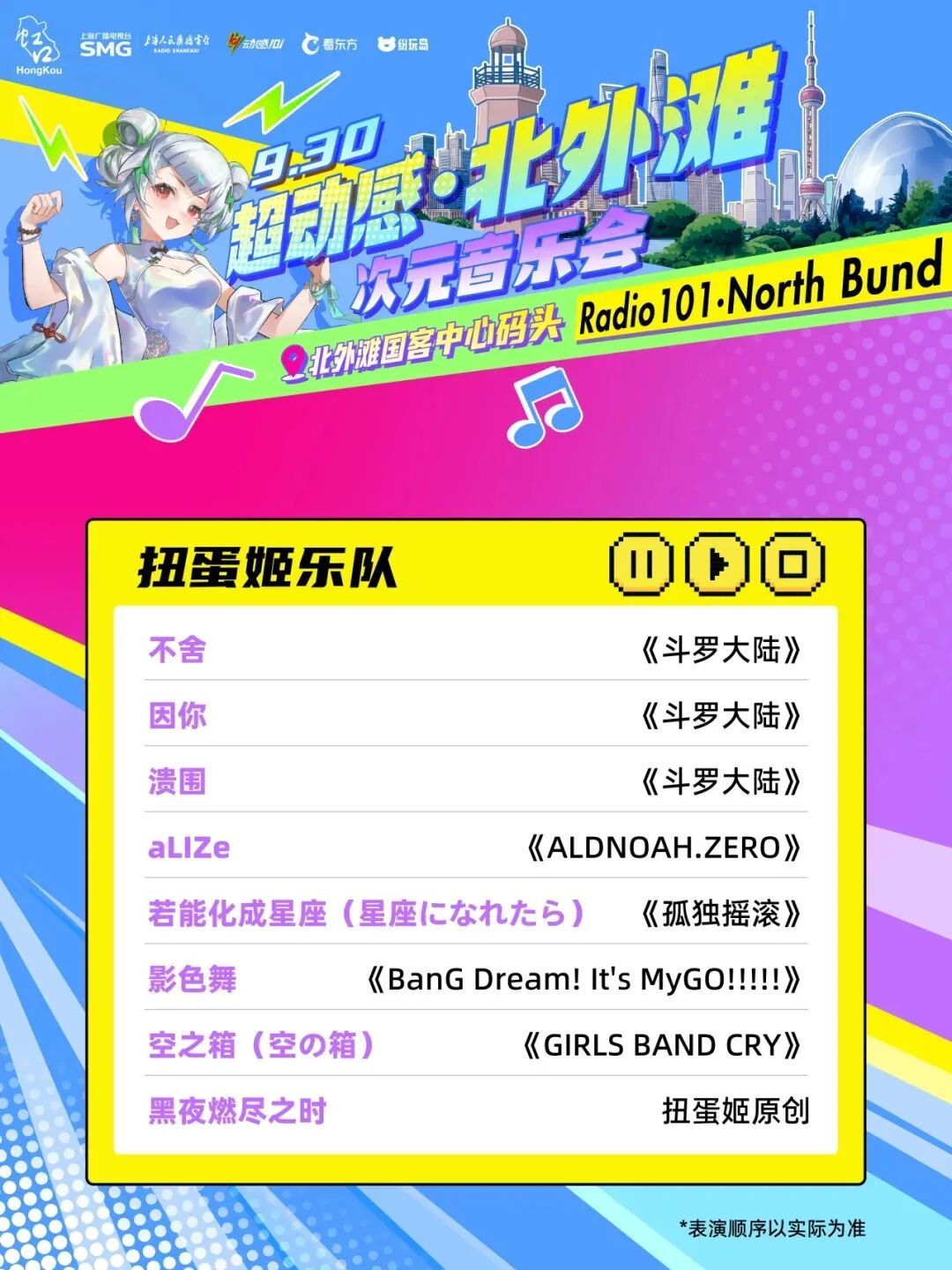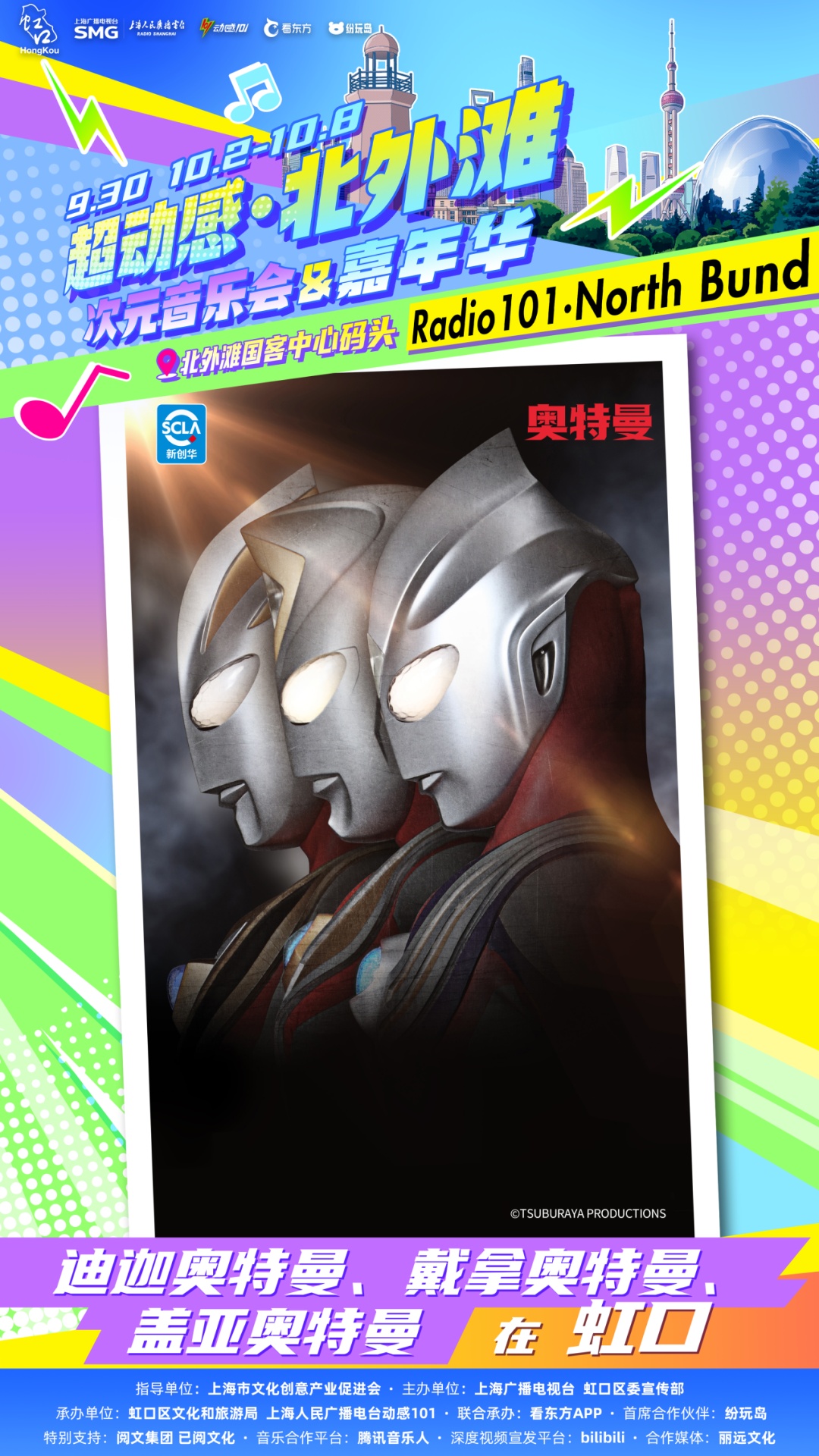 由上海广播电视台、虹口区委宣传部主办,虹口区文化和旅游局、上海人民广播电台动感101承办的“超动感·北外滩次元音乐会”将于9月30日上演。音乐会集合了十余个动漫、游戏IP,每个IP都带来了限定展陈或限量礼品。活动当天,现场还将有创意市集全程开放,近百个摊位汇集了众多二次元周边以及手工匠人精心打造的创意物品!千万不要错过哦~ 10月2日至8日,可通过“Radio生活家”或“看东方”微信小程序购票~还可以通过阿基米德app、“阿基米德米仓”微信小程序预约参加次元音乐嘉年华游园活动。 (微信小程序搜一搜“SMG看东方”进入) 打开“SMG看东方”小程序,点击首页banner图,进入“超动感·北外滩次元音乐会”专区了解更多活动及售票信息。 (“阿基米德米仓”微信小程序) 01 一人之下 《一人之下》将设置“哪都通”快递柜,观众可以现场挑柜门拆“盲盒”。 02 全职高手 《全职高手》将以“荣耀十年”为主题,特设国风剪纸艺术装置墙及“荣耀奖杯”打卡区,让每位观众都能沉浸式体验属于自己的顶峰相见“荣耀时刻”。 03 狐妖小红娘 《狐妖小红娘》将打造“狐妖月老办事处”和“相思树”,观众可以现场挂祈愿牌、抽红绳、摇签筒,沉浸式感受《狐妖小红娘》的氛围。 04 崩坏:星穹铁道 人气游戏《崩坏:星穹铁道》将带来丹恒·腾荒主题花灯,来现场即可和超大的丹恒·腾荒花灯装置合影! 05 王者荣耀 即将迎来上线10周年的《王者荣耀》,将以“英雄共赴茶叙,十年温暖相逢”为核心,在黄浦江边打造“下午茶会客厅”! 还有奥特曼、初音未来、名侦探柯南、面包超人 ...... 更多IP玩法等你现场解锁 豪华原声歌单 全程跟唱! 来源:上海发布 编辑:孙洁静