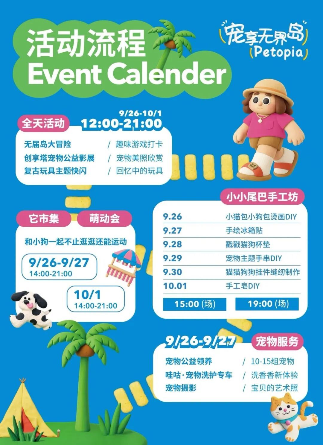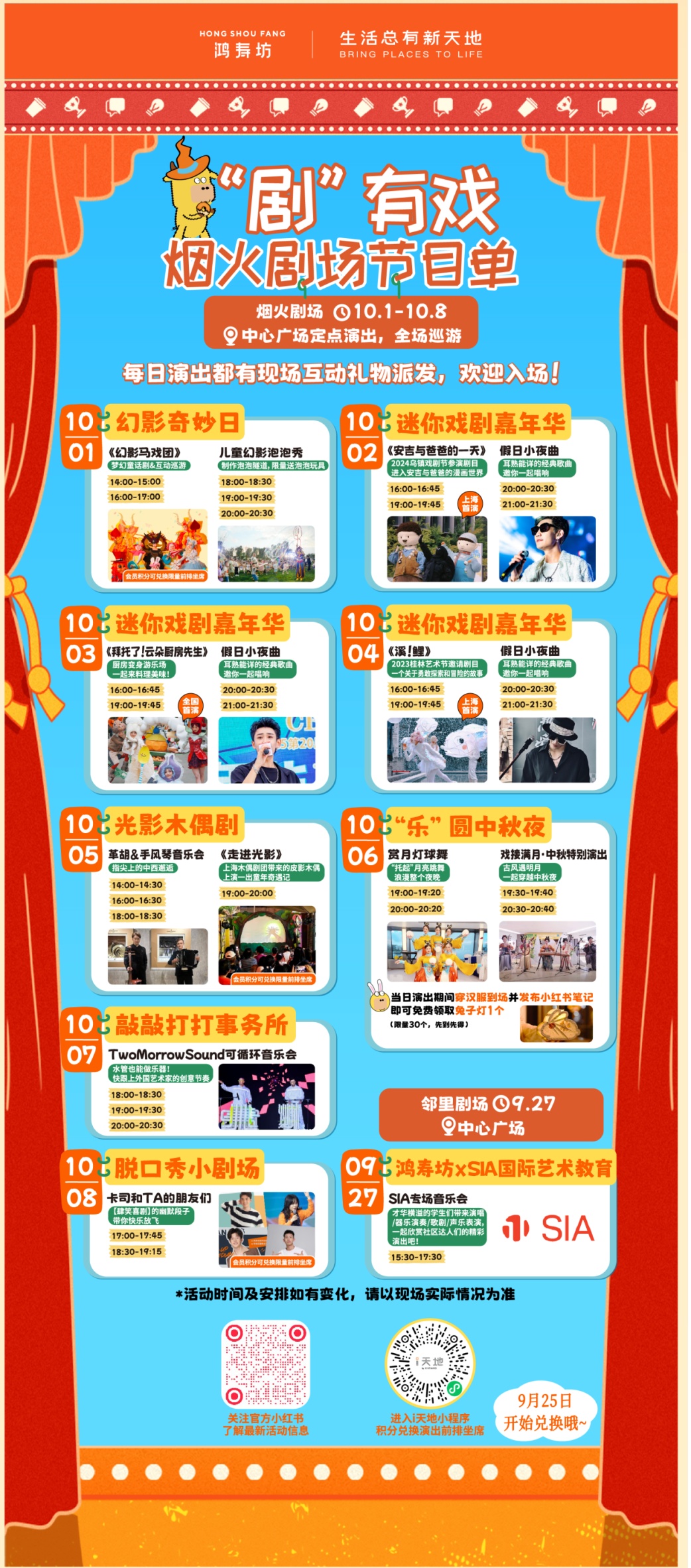 佳节将至,国庆中秋喜相逢,长寿商圈为广大市民、游客朋友准备了一系列精彩活动。从苏河畔的甜品嘉年华与蓝调晚风,到里弄剧场的烟火狂欢,再到石库门里的海派腔调音乐,更有萌宠专属的治愈乐园,“精致感”与“烟火气”撞个满怀,快来长寿商圈邂逅月色与繁华,解锁属于你的独家假期记忆。 随着上海首座悬索人行桥——百合桥正式通行,天安千树借势启动“甜蜜引力波”主题活动,将消费场景延伸至苏州河滨步道。 10月1日至10月8日每天11:00–21:00将在千树室外河滨步道开启“甜品嘉年华”,活动汇聚廣蓮申、勒芬、Openopen等10余家高含金量品牌,涵盖上海首次的稀缺款、社交平台爆火的网红款及社区小众宝藏款。 从法式马卡龙到中式酥点,从现烤面包到创意冰品,一站式满足甜品爱好者的味蕾期待。现场同时设有Live音乐会,当蓝调旋律伴着苏州河的晚风流淌,“苏河两岸甜蜜蓝调时刻”将成为最治愈的夜景记忆。 10月1日到10月8日,鸿寿坊启动“烟火剧场开心季”,老上海的里弄空间将变身“开放式狂欢剧场”!中心广场内乌镇戏剧节同款剧目、光影木偶剧、光影泡泡秀、创意打击乐秀、脱口秀……轮番上演。 国庆中秋叠加周年庆,惊喜福利更是“码上加码”。今天(9月28日)周年庆当天,多重活动等你来:1000份定制庆生蛋糕免费派发;沪上奇遇歌舞秀将融合上海风情与现代元素,带来沉浸式表演;夜晚汪汪队机甲焰火盛典将点亮夜空,机甲造型与绚烂焰火的结合,为孩子们打造童话般的节日记忆,也让成年人找回童年乐趣。 地处火车站——长寿路黄金动线的统益里,以“海派精品文化潮流街区x弄堂音乐角”的复合场景,为假期注入独特腔调。 10月1日至10月8日,统益里每日将举办午间场(11:30-13:30)和晚间场(17:30-19:30)两场演出,沪语原创、经典金曲、电音、乐队、民谣等风格轮番登场,石库门建筑的青砖黛瓦与动感旋律相映成趣。 活动汇聚了上海本土及知名音乐人,包括沪语唱作人老油条、“上海小哥”吴晓强、海申乐队、DJ D.K、林梦晴、张迪等。场内还设置弄堂躺椅区,让人们在轻松的氛围中感受“老弄堂里的新腔调”。 国庆中秋假期,毛孩子也有专属狂欢!即日起至10月1日,“宠享无界岛(Petopia)”强势登陆创享塔,为养宠家庭打造沉浸式萌宠乐园,现场设有萌宠市集、宠物运动会和手工体验区,家长可以带着毛孩子运动打卡、定制心意好物;公益板块将联动宠物救助机构,开展领养咨询,传递温暖。 此外,乐园还提供宠物美容、摄影等服务,让毛孩子在节日里也能“焕新亮相”。无论是带宠物参与互动游戏,还是打卡萌宠主题装置,都能解锁“人与宠物共享的欢乐时光”,妥妥是假期里最暖心的画面。