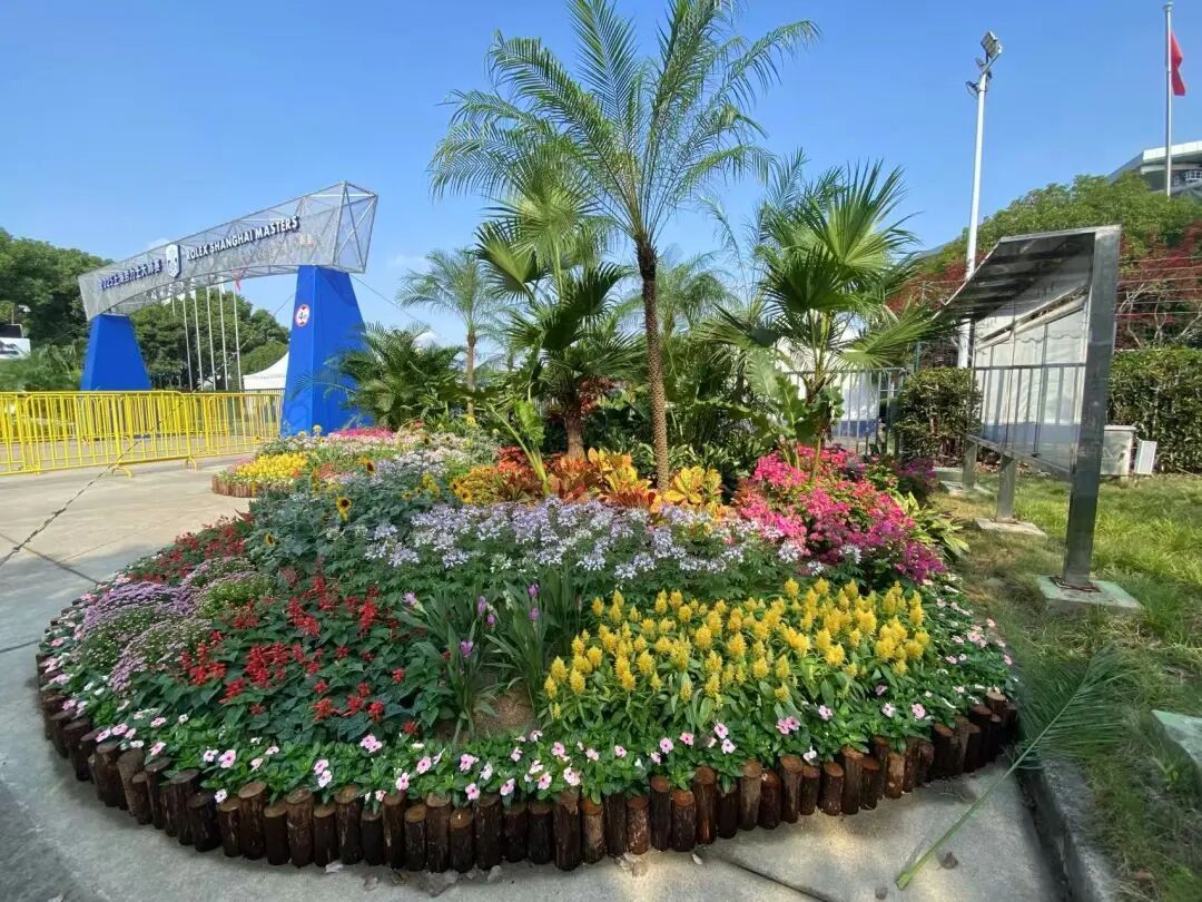 区绿化市容局相关负责人介绍,花境用黄沙在水泥基底上构建自然起伏的地形肌理,增加空间层次感,骨架植物选择针葵、散尾葵、象耳芋等热带植物,构建背景屏障,通过不同叶形质感的对比形成热带植物群落景观;向日葵、鸡冠花、醉蝶花、球菊等时令草花组成丰富的花丛,色彩渐变由暖至艳,“热带植物有200多株,种植及储备补种的草花有3000多盆,确保整个赛期绿化景观面貌”。