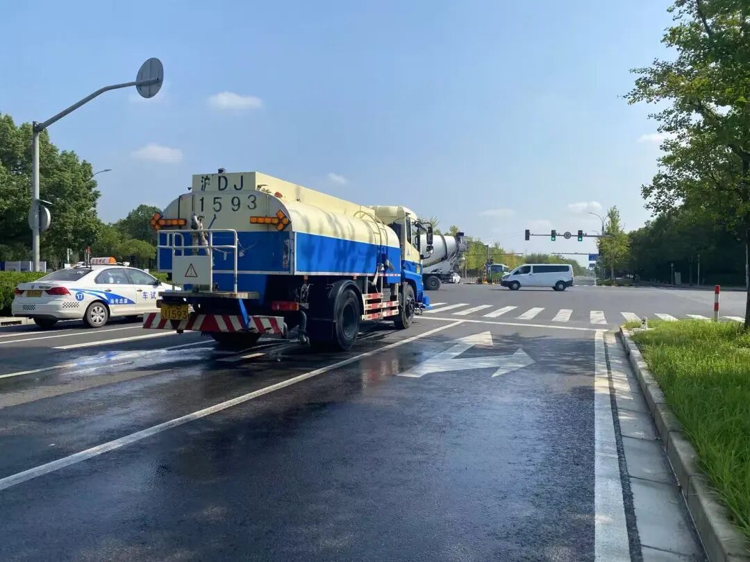 说话间,一辆洒水车路过。据称,这块区域的道路采取的是以机械化作业为主、人工作业为辅的高标准保洁作业模式,几天前保洁人员就对周边人行道路面进行了全面冲洗,确保人行道无污迹、无积尘、无青苔,道路整洁见本色。冲洗结束后工人又对沿街长凳、公交站台及其他功能性设施进行人工擦拭,确保表面干净、无水渍。