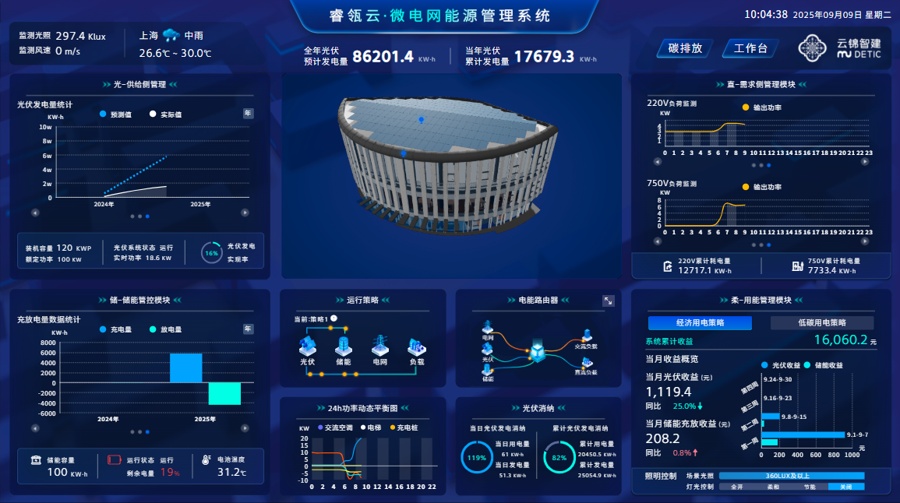 近日,在2025国际零碳城市乡村与零碳建筑大会上,东航金叶苑4号地块贝壳楼斩获零碳建筑认证及全国首批三星级建筑光储直柔系统荣誉,成为建筑领域绿色低碳转型的标杆案例。这座矗立在徐汇滨江的“绿色建筑”,以能发电、可储电、会智能调度的创新模式,将“零碳”从概念变为可感知的现实。 该项目位于上海徐汇滨江,东临天钥桥南路,南至龙耀路,北至龙启路,地块西侧及南侧临河道。项目地上二层为展示办公空间。项目整体实现能源自给自足,实现全电气化无外购能源,光伏系统年发电量达11万度以上,完全满足全年用能需求,降碳率达100%。 贝壳楼的“零碳密码”,藏在屋顶与墙面上。屋顶铺设了224块单晶硅太阳能电池组件,每年可生产约18.9万度清洁电能。更特别的是,建筑外墙部分采用自主研发专利的可发电光伏玻璃幕墙系统,26块光伏发电玻璃组成“发电皮肤”,最大化建筑本身的可再生能源供应。 这些绿电不仅能满足楼内空调、照明、热水等全年用能需求,多余的电能还会被存入“充电宝”——储能系统。哪怕是阴雨天或夜晚,也确保该微电网系统能稳定供电,保障楼内设备运转不停,真正实现绿电100%自给。 如果说光伏板是“能量生产者”,储能系统是“能量仓库”,那么贝壳楼的“电能路由器”就是整个光储直柔系统的“能量中枢”。这个集控中心占地虽小,却肩负着能源调度的重任:它能实时监测发电、储能、用电数据,动态优化能源流向。 光照充足时,优先将光伏电力直接供给直流空调、照明设备等,同时把富余电能存入储能系统;光照不足时,秒切储能供电保障关键负荷;极端情况下还能与电网柔性互动,确保用能“不断档”。更贴心的是,其配备的人机交互界面可实时展示发电、储能、设备运维状态,数据同步接入智慧零碳楼碳排放管理平台,让能源流动“透明可感”。 楼内构建了完善的直流配电系统。直流电如同行驶在“专用快车道”,省去了传统交流电多次转换的损耗,传输效率提升80%以上,从终端设备层面筑牢节能根基。 基于BIM底座的“睿瓴云”数字能源管理平台,是贝壳楼的“柔性调度师”。它通过监测零碳楼所有设备用能数据、预测未来用电高峰、控制用能设备运行,从而实现柔性调度,确保让每一度绿电都用在“刀刃上”,实现用能成本最优和绿电收益最大化。 此次获奖,标志着贝壳楼在技术创新、系统集成、能效表现及低碳实践等方面均达到了星级测评的高标准要求,充分展现了云锦智建在推动“光储直柔”技术工程化、规模化、多样化应用方面的引领作用。 未来,云锦智建将以“AI+好房子”为方向,依托贝壳楼为展示平台,聚焦新材料研发、科技成果转化及生态链整合,持续优化用户体验,推动市场化转型,助力“好房子”与零碳建筑协同发展,为行业绿色转型提供可复制、可推广的方案。