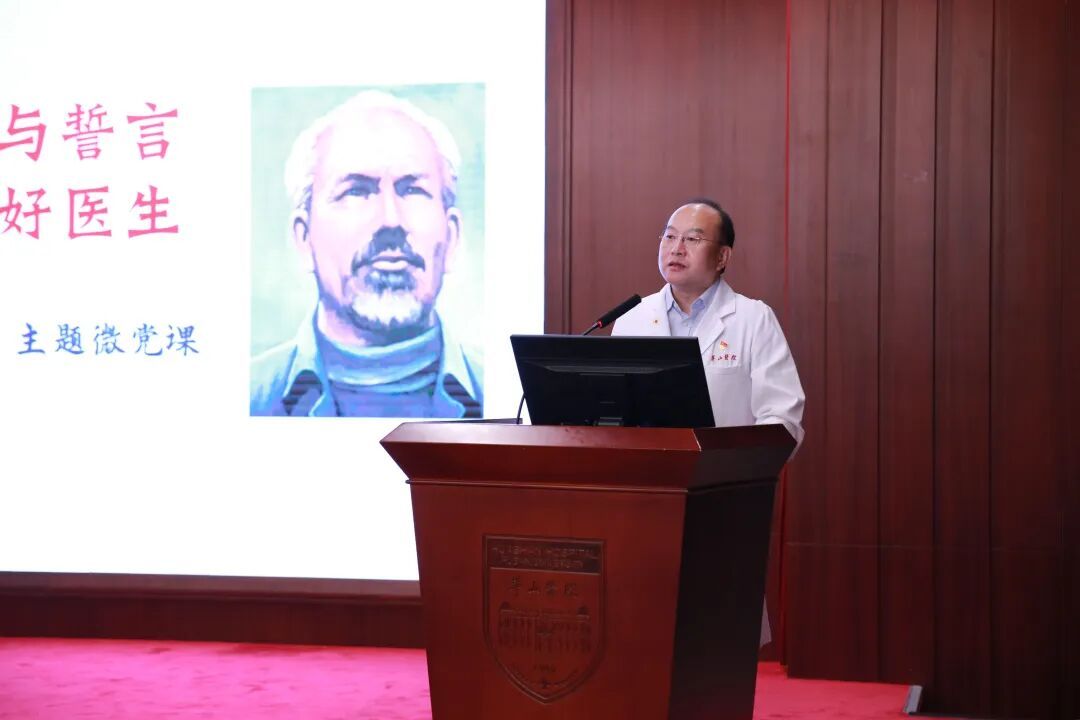 9月28日下午,华山医院党委“信仰· 榜样 ·感悟与誓言——学习白求恩做人民好医生”2025年“班后一小时”主题微党课第三课开讲。华山医院党政领导班子现场参加,全体党员通过线上直播、线下各会场同步学习。微党课由党委副书记顾宇翔主持。