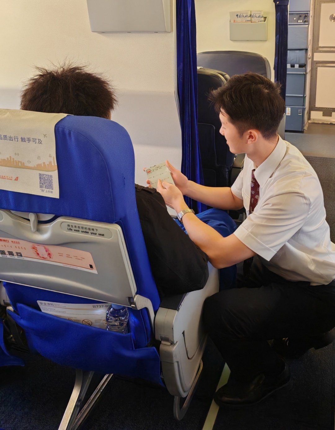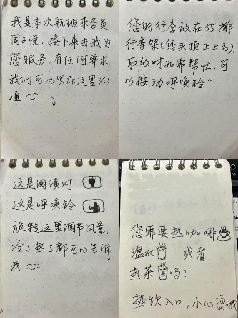 泉州晋江机场,听障旅客陈女士在地面人员陪同下抵达MU2650登机口,乘务长罗嘉涵早已等候在此,微笑交流后,将乘务员周子悦介绍给她。周子悦立刻递上封面写着“您好,陈女士”的笔记本。登机后,她帮陈女士放好行李,用笔记本逐页标注行李位置、呼唤铃用法,还细致介绍阅读灯、空调调节方式,每一步都停顿确认陈女士能理解。供饮时,她列好热饮选项并画小茶杯,端来咖啡时不忘提醒“小心烫”。当陈女士用手机打字表达感谢时,周子悦在本上暖心回应“不用客气,我们一直陪您。”让陈女士全程满是安心。
