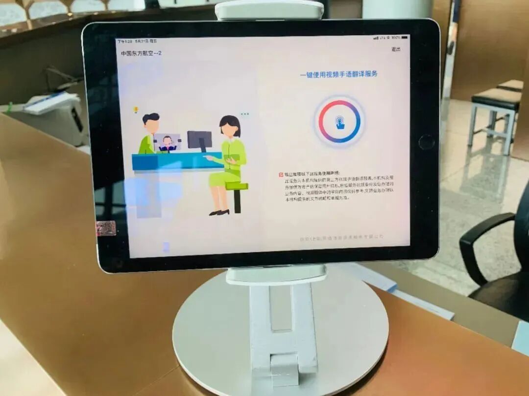2019年东航正式推出国内首款航空手语服务APP,为提升听障旅客服务体验提供“智能化”选项。听障旅客来到东航爱心柜台后,工作人员会帮助旅客启用柜台前的手语同声翻译APP,通过点击“一键使用视频手语翻译”按钮,即可迅速接通后台专业翻译团队,实现手语实时在线翻译,为听障旅客建立及时有效的沟通连接,操作简单且快捷。