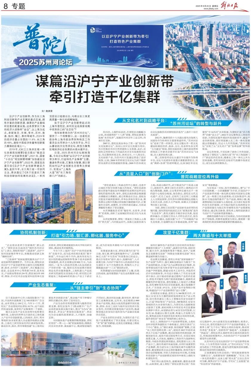 日前,2025苏州河论坛刚刚落幕。今年论坛围绕“以沿沪宁产业创新带为牵引,打造特色产业集群”主题,邀请各界共商,汇聚各方智慧,探讨普陀如何以产业创新生态培育为突破口,实现从“上海西大堂”到“长三角创新门户”的跃迁。