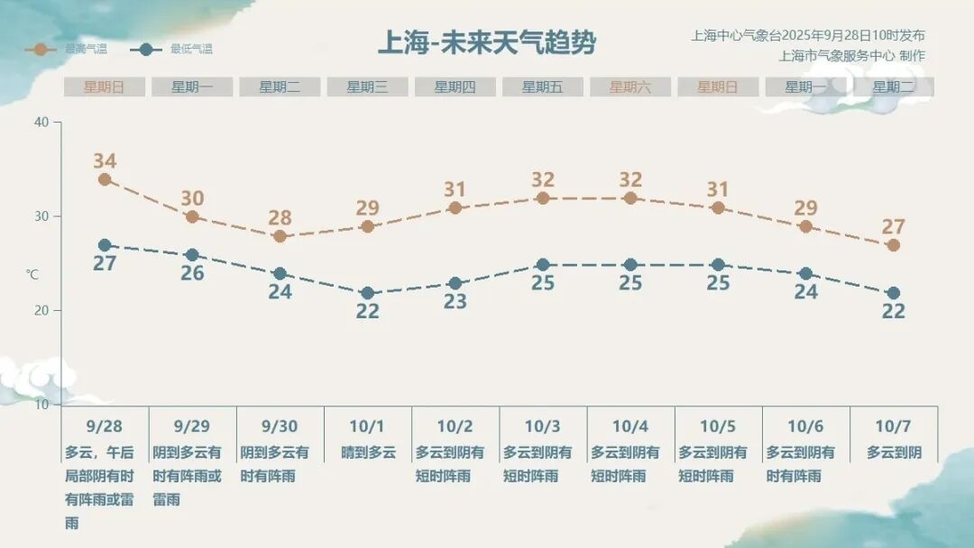 上海中心气象台预计,明后天上海云系更多,降水也更为明显,在北风和雨水双重打压下,气温终于降至30℃以下。国庆节当天,上海天气晴好,气温也比较适中;10月2日到6日,云系较多,有些小范围的短时阵雨,气温在23~32℃之间,较常年偏高。
