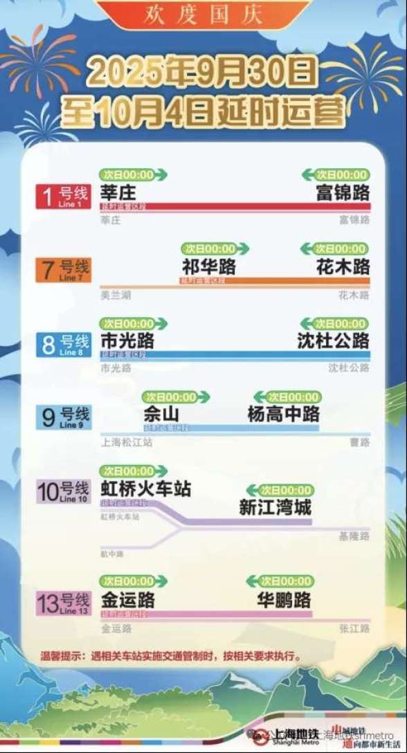 其中,9月30日至10月4日,上海地铁1、7、8、9、10、13号线将实施延时运营方案,提升夜间运力;10月1日至10月6日每日16:00起,2、10号线南京东路站及14号线豫园站将临时封站,期间10号线豫园站正常运营;长假末期的10月7日至10月8日, 1、2、10、17号线将加开夜间定点加班车,末班车延至次日0点,全力疏解返程大客流。