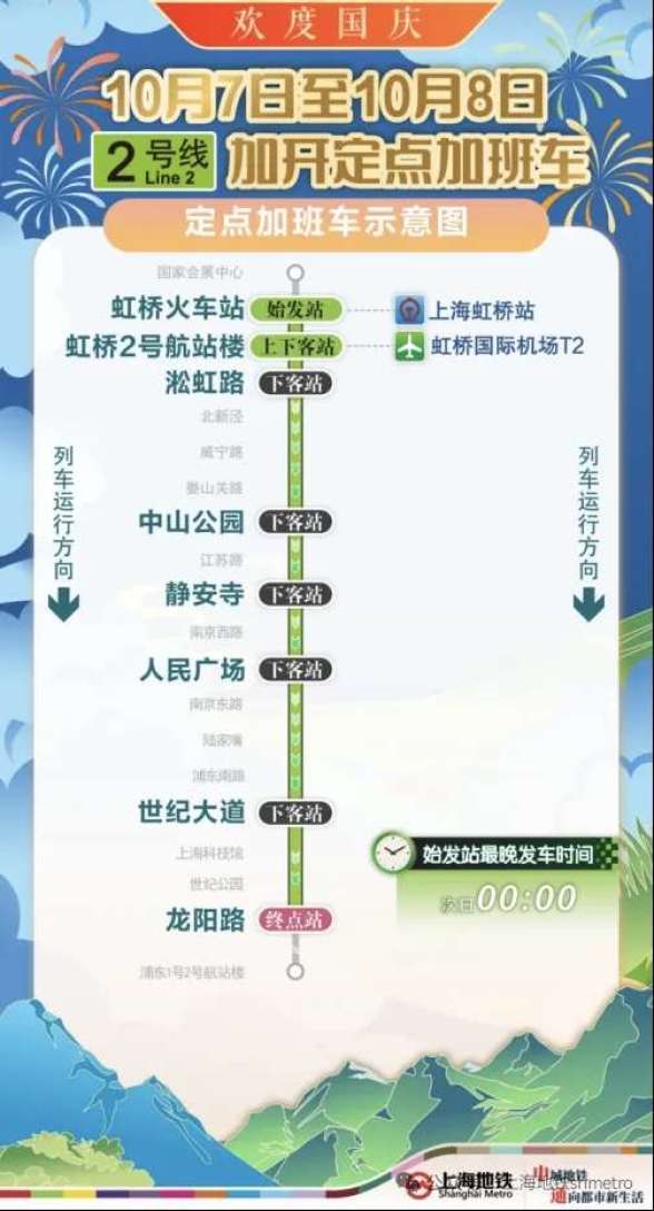 为提升国庆返程期间重要交通枢纽夜间疏散能力,根据计划,10月7日至10月8日,地铁1、2、10、17号线将加开定点加班车,末班车发车时间延长至次日0点。同时,地铁运营方还将密切关注虹桥枢纽夜间客流情况,根据现场客流需求或将进一步延长定点加班车开行时间。