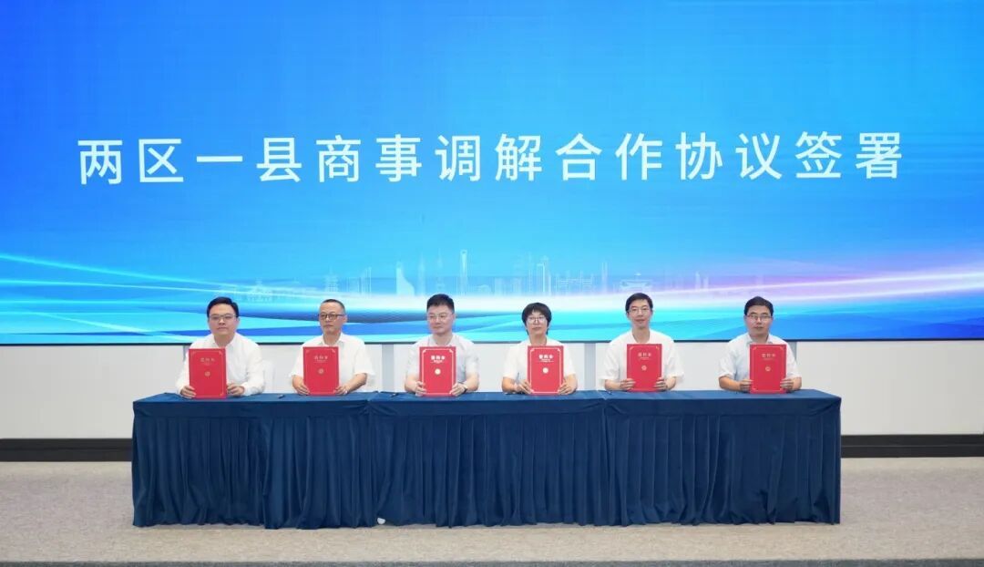 活动设置沙龙交流环节,两区一县司法局、人民法院,聚焦商事调解一线案例与实际需求展开面对面探讨,与会代表分享大量实用的干货与经验,梳理跨区域协作中的堵点难点,为下一步工作明确方向。两区一县司法局、人民法院共同签署《长三角一体化示范区提升商事调解服务质效助力优化营商环境合作协议》,将“交流共识”转化为“行动契约”,标志着示范区跨区域商事调解协作机制进一步落地见效,为示范区营商环境优化提供制度保障。