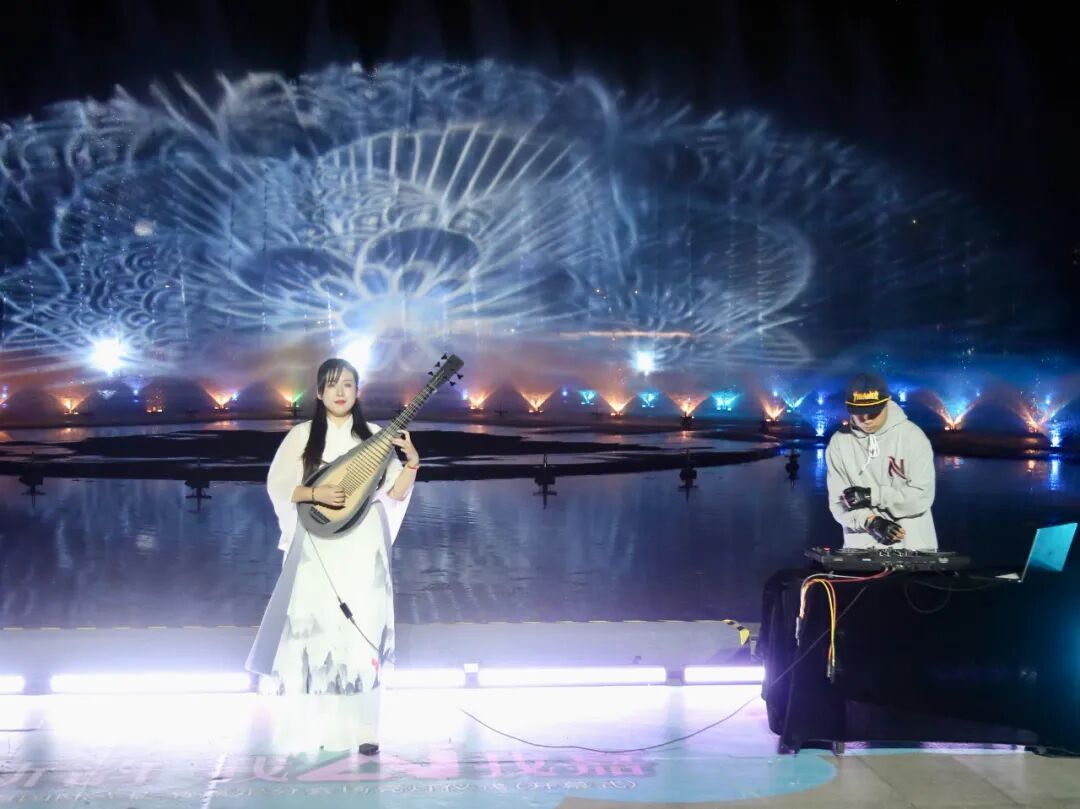 光影交织间,嘉定独有的风雅与诗意跃然眼前。现场观众或凝神静观,沉浸在水影、声光交织的奇幻氛围中,或举起手机,定格这一浪漫瞬间。