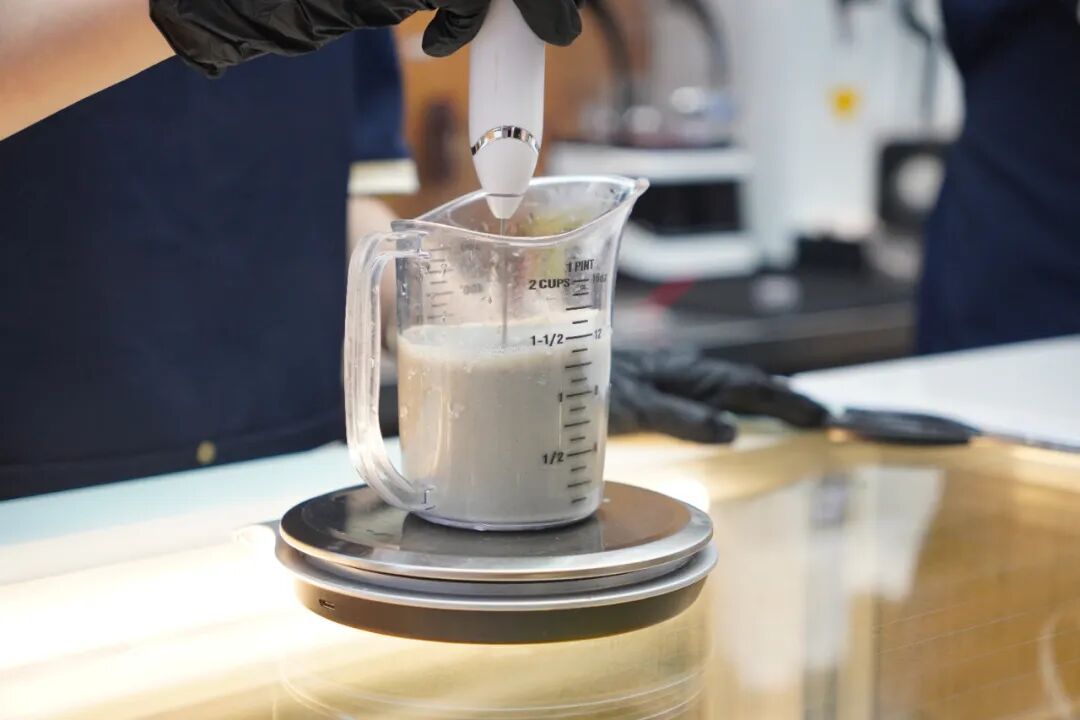 试营业近一个月以来,店里已积累了不少回头客,刘女士就是其中的一位。这天,她特意来店里点了几杯豆乳茶,准备带回家分享给孩子。“这里的豆乳茶配料表干净,基本就是豆子,没有添加剂,也喝不出一点豆腥味。”刘女士熟络地分享道,“现在想找到一杯成分简单、喝着安心的饮品不容易。”