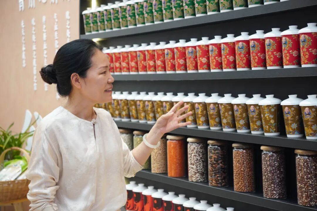 推开“豆叔”门店,仿佛步入一间小型的豆类展览馆,目之所及皆是豆文化展示。最引人注目的,是正对大门的一整面墙上,被分隔成数十个格子,按照五行、方位、五脏、五腑、五味、五色等分类存放着各种豆子。在墙灯的照射下,每一颗豆子都被镀上一层温润的光泽。旁边的货架上摆放着各种口味的豆浆粉,以及豆花酥、豆腐乳等小吃。空气中弥漫着淡淡的、令人安心的豆香,仿佛在无声地诉说着每一颗豆子从田间到店里的旅程。