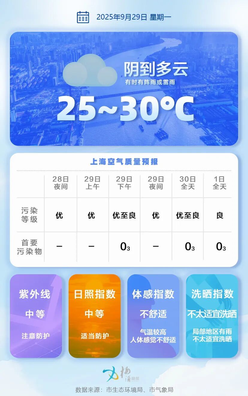 今天阴到多云有时有阵雨或雷雨,25~30℃,相对湿度95%~60%,偏北风3~4级,沿江沿海地区4~5级,雷雨时阵风7~9级。今明两天本市有一次较明显的降水过程,主要降水时段在29日下午到30日白天,出行注意交通安全。