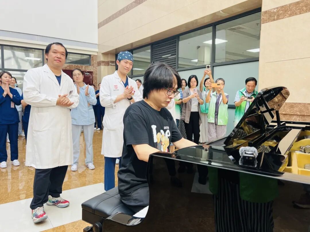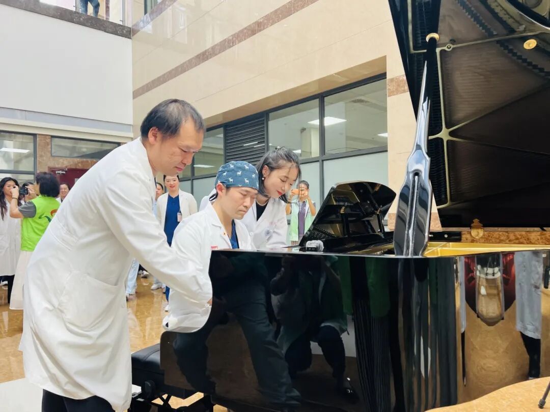下午开诊不久,一阵轻快的钢琴声突然响起。医院老年科、神经外科、康复医学科的医生们与钢琴家宋思衡齐聚于三角钢琴前,联袂献上一首《土耳其进行曲》。耳熟能详的旋律响起,立刻吸引了众多候诊患者及家属的注意。