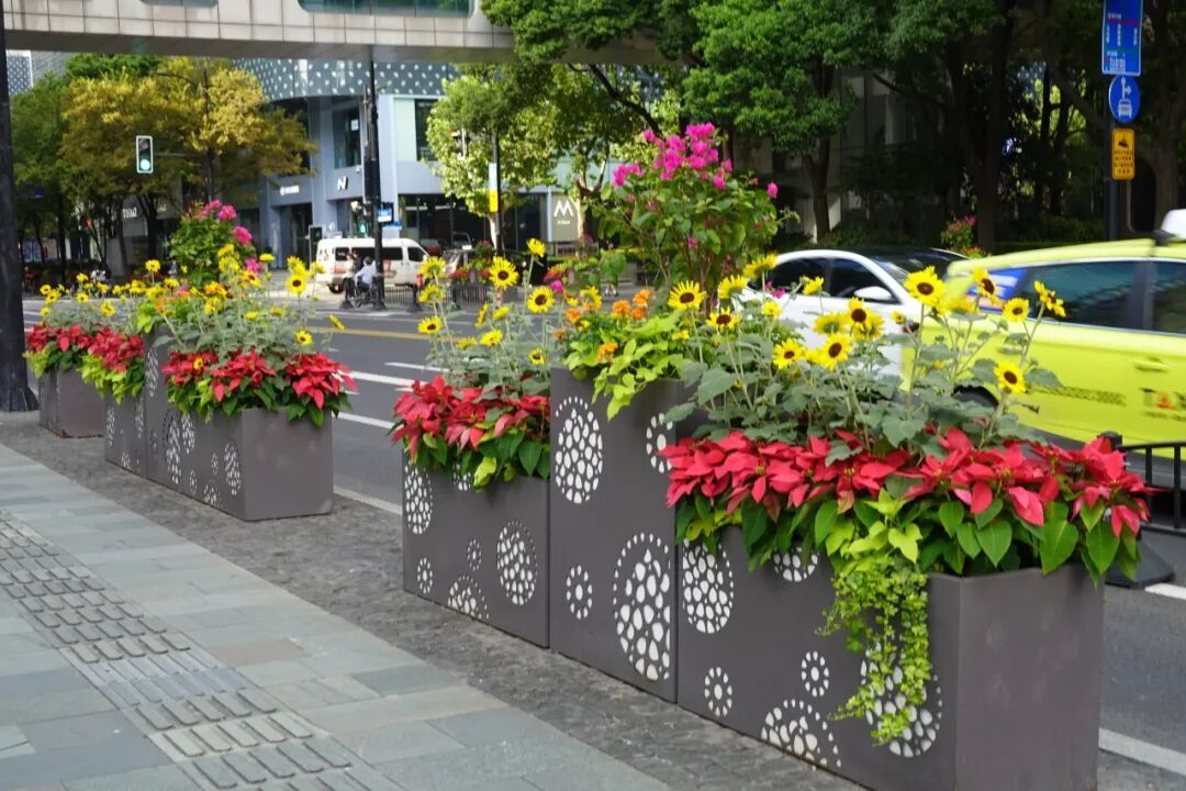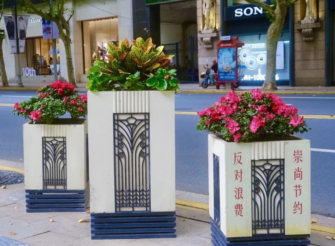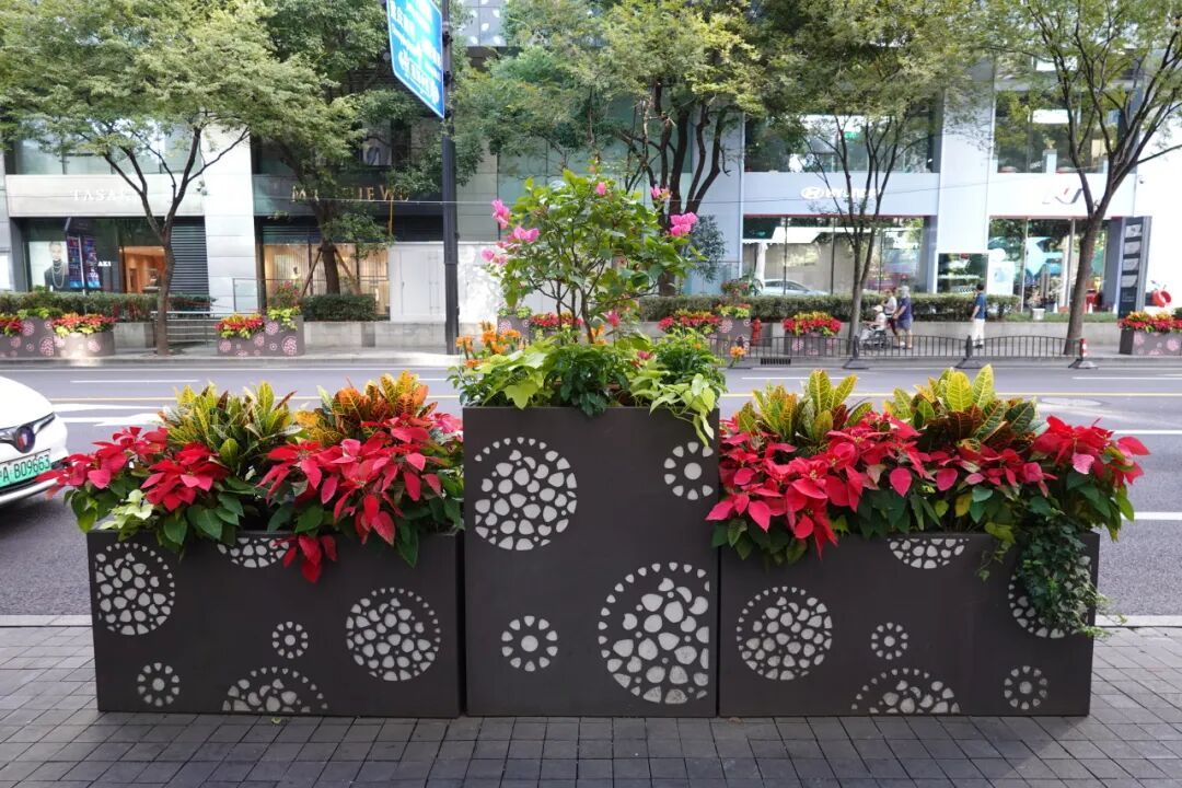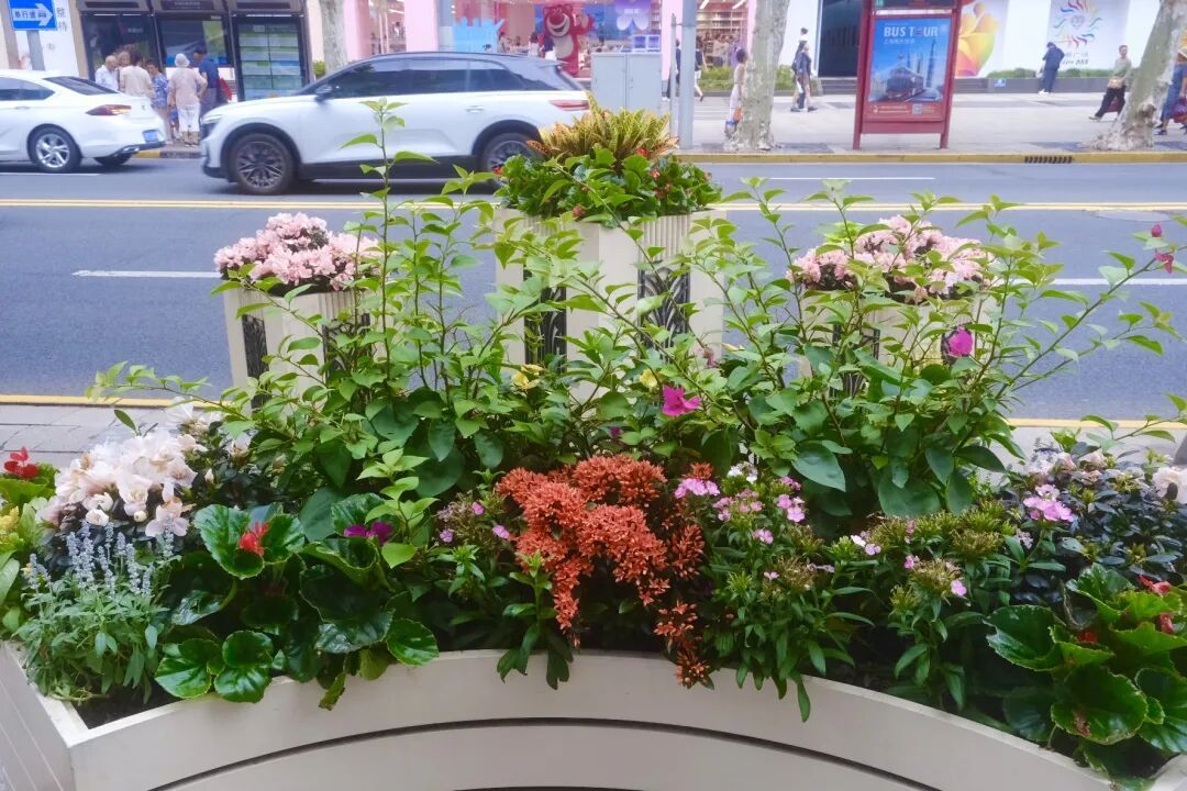 淮海中路的景观花箱以色彩明艳的变叶木、热烈盛放的三角梅、娇俏灵动的超级海棠为视觉核心,再辅以鼠尾草、西洋鹃,多种植物错落搭配、相映成趣,既烘托出浓厚的节日氛围,也为街区营商环境增添了生态活力,让商业空间与自然之美和谐相融。
