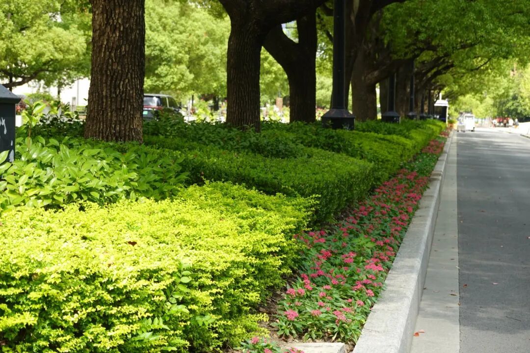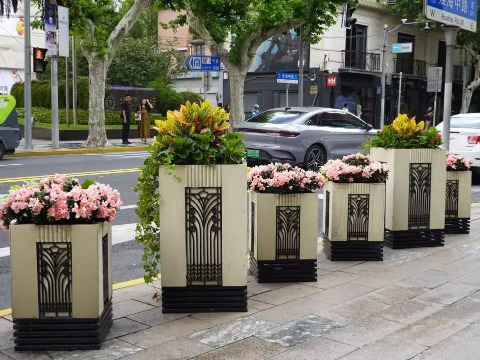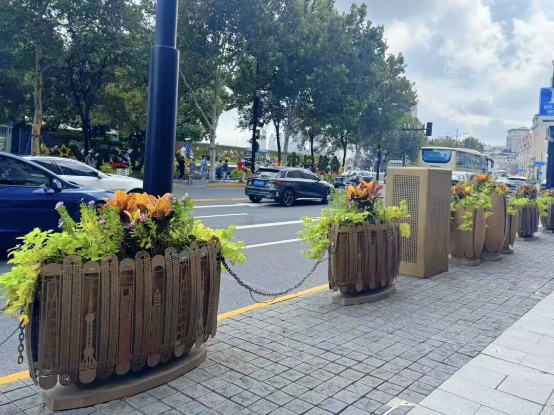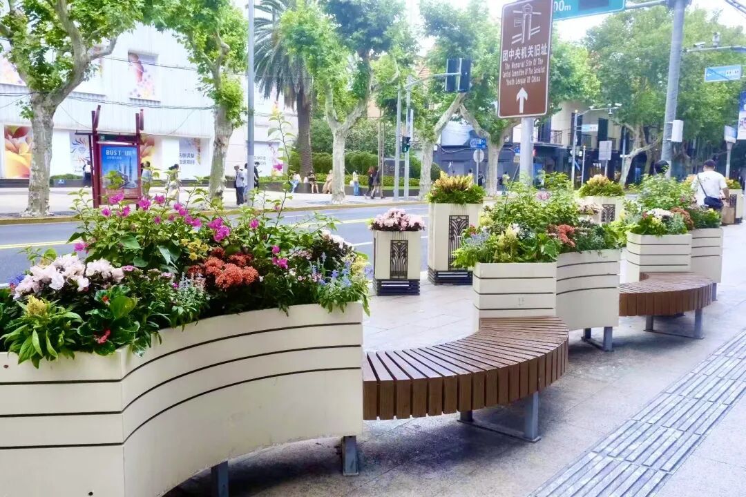 淮海中路的景观花箱以色彩明艳的变叶木、热烈盛放的三角梅、娇俏灵动的超级海棠为视觉核心,再辅以鼠尾草、西洋鹃,多种植物错落搭配、相映成趣,既烘托出浓厚的节日氛围,也为街区营商环境增添了生态活力,让商业空间与自然之美和谐相融。
