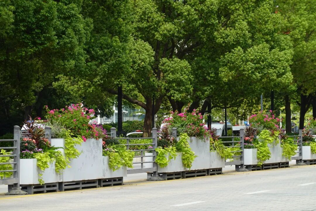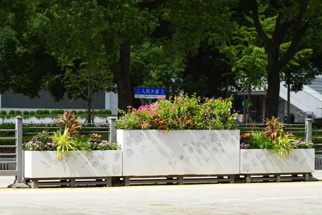 漫步人民大道,花箱里的植物组合尽显巧思,三角梅、龙船花、千日红绽放出热烈色彩,金叶甘薯、朱蕉、比利时杜鹃球、长春花、狐尾天门冬及金心斗兰则从叶色、株型上巧妙搭配,让整个花箱景观饱满鲜活,喜庆氛围扑面而来,尽显节日盛景。