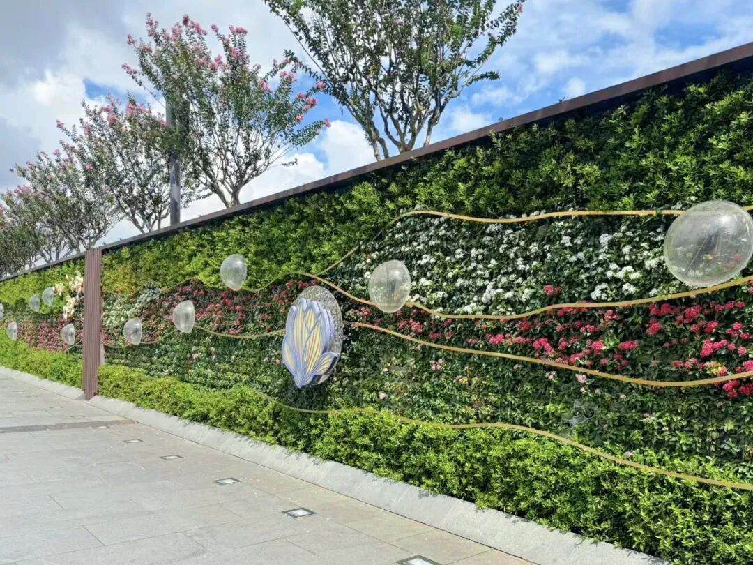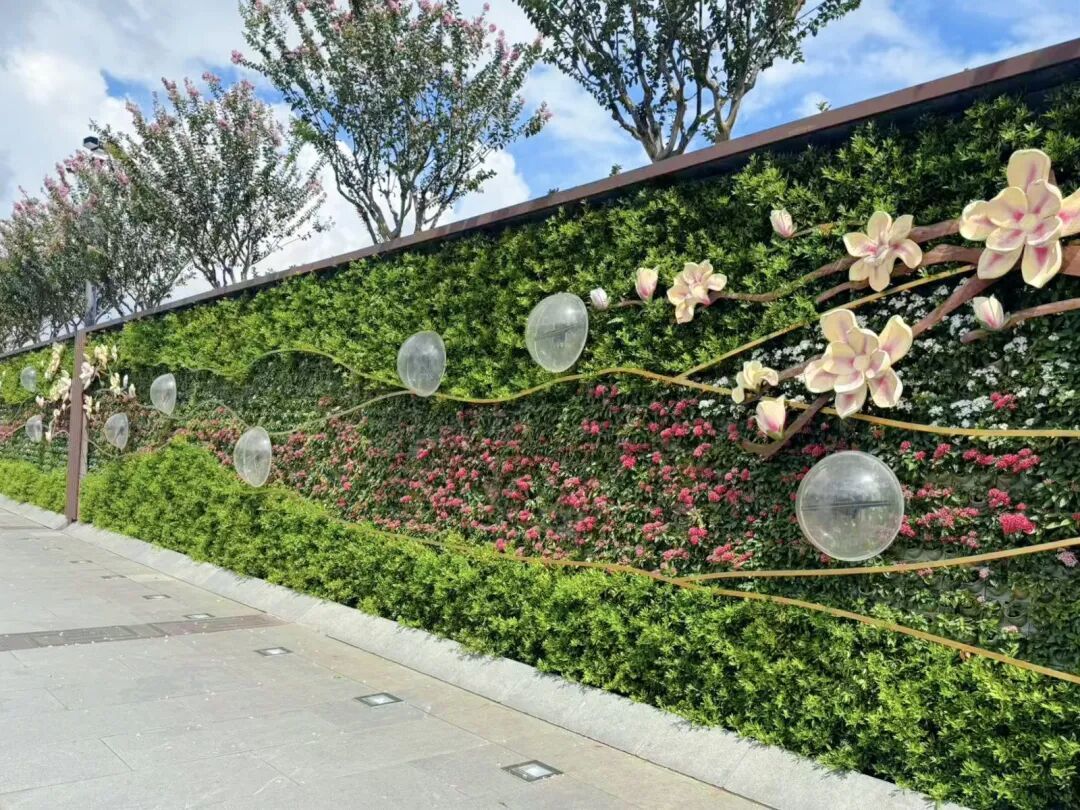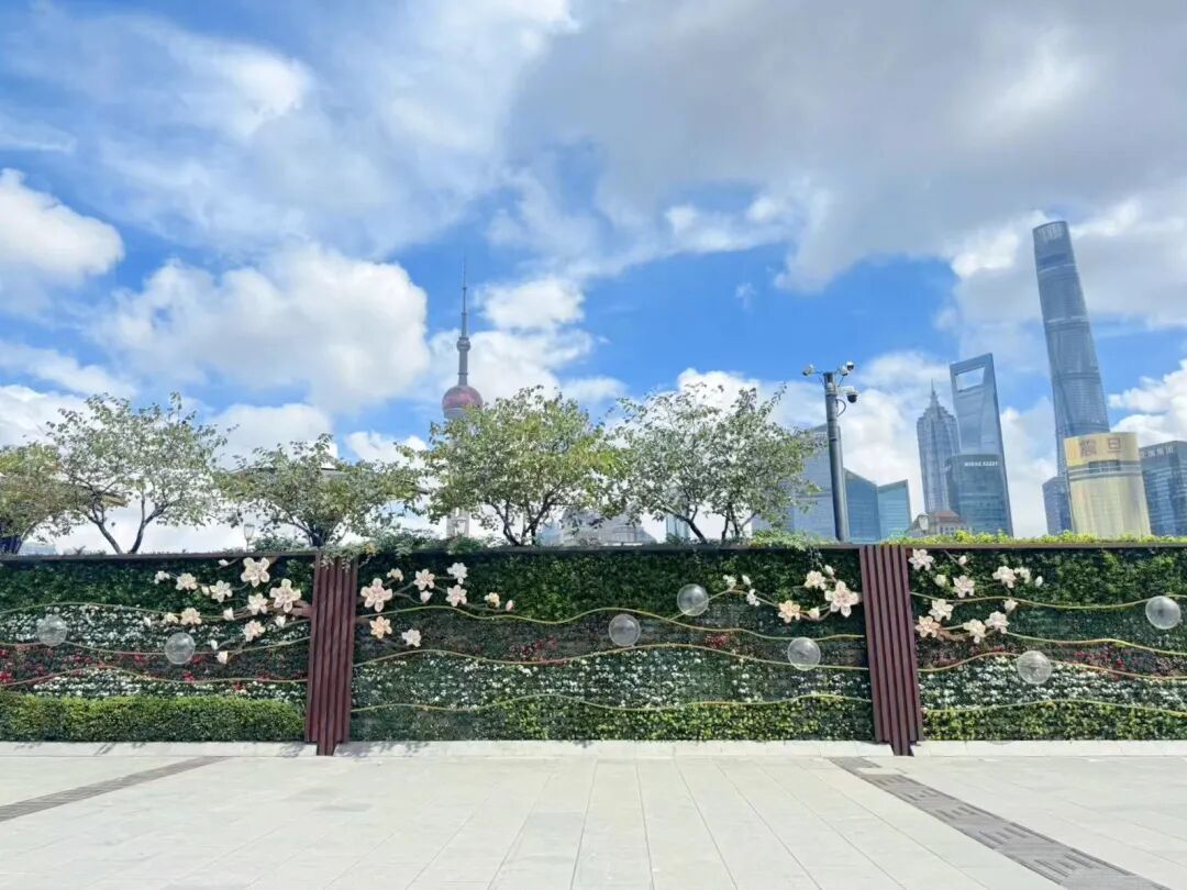 外滩花墙的设计独具匠心,从《千里江山图》中汲取灵感,将大好河山的壮阔景致凝于一方花境。繁星花、小叶栀子与比格海棠的精心配置,于绿意繁花间既显山河之美,更寄寓着中国繁荣富强的美好愿景,以此盛景庆贺国庆中秋佳节。