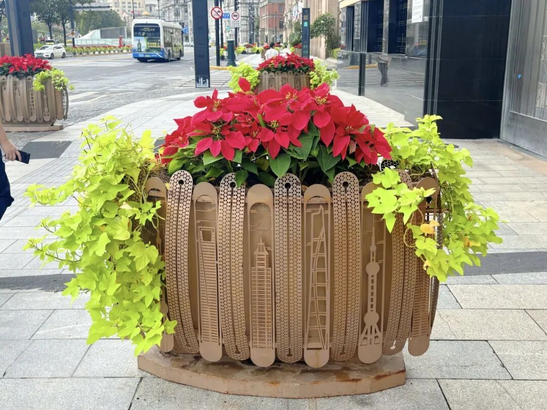 为烘托国庆热闹氛围,外滩花箱精心选用圣诞花与金叶甘薯进行植物配置,艳红夺目、金叶亮眼,让节日的欢腾感扑面而来。