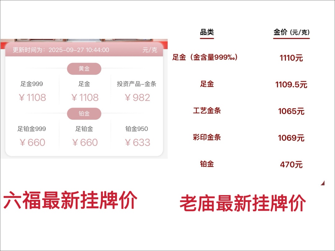 根据9月27日的报价,国内传统黄金饰品品牌价格全线站上了1100元/克。当天,周大福、周生生、六福三个品牌足金报价均是1108元/克,老庙黄金1100元/克。