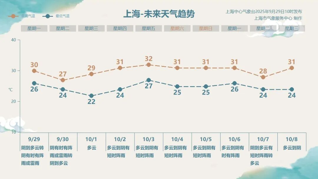 今明天气:今天上午上海以多云到阴为主,下午起雨水将再度显现,雨势变大是在今天夜间到明天白天,并伴有雷电,预计局部地区的累积雨量可达大雨到暴雨。雨天路滑,又正值节前出行高峰,出行多注意安全。雨水和冷空气共同作用下,今明天的气温终于出现下降趋势。今天早间大部分地区最低气温在23~26℃之间,出门有了一丝凉意。预计今天的最高气温在30℃左右。明天气温再降,在24~27℃之间。