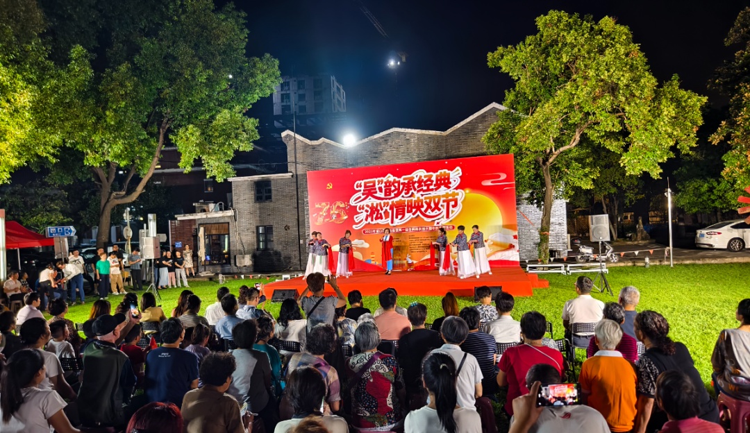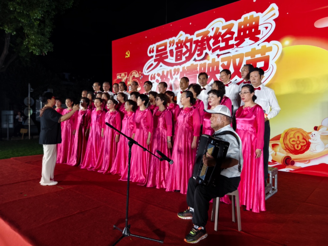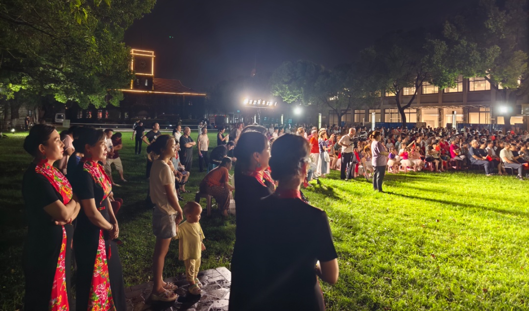 活动开始后,文艺汇演精彩亮相,为观众奉献一场融合传统韵味与时代气息的文化盛宴。民乐《影视歌曲三联奏》率先登场,悠扬旋律串联起经典影视光影记忆;扇子舞《我的祖国》舞姿灵动,深情礼赞祖国;沪剧《绣红旗》韵味十足,吴侬软语中满是对祖国的赤诚与热爱,这份深情令人动容;沪剧表演唱《相亲》让观众沉浸式感受海派文化魅力;军嫂旗袍队优雅登场,一袭华服演绎岁月风华;笛子独奏《沂蒙山歌》清亮悠远,勾勒出革命老区的淳朴画卷;泗东幼儿园的孩子们带来的舞蹈《爱跳舞的小怪兽》活泼可爱,萌趣舞步点燃全场热情;大合唱《今天是你的生日》为当晚的文艺汇演压轴登场,现场掌声不断,节日氛围热烈。