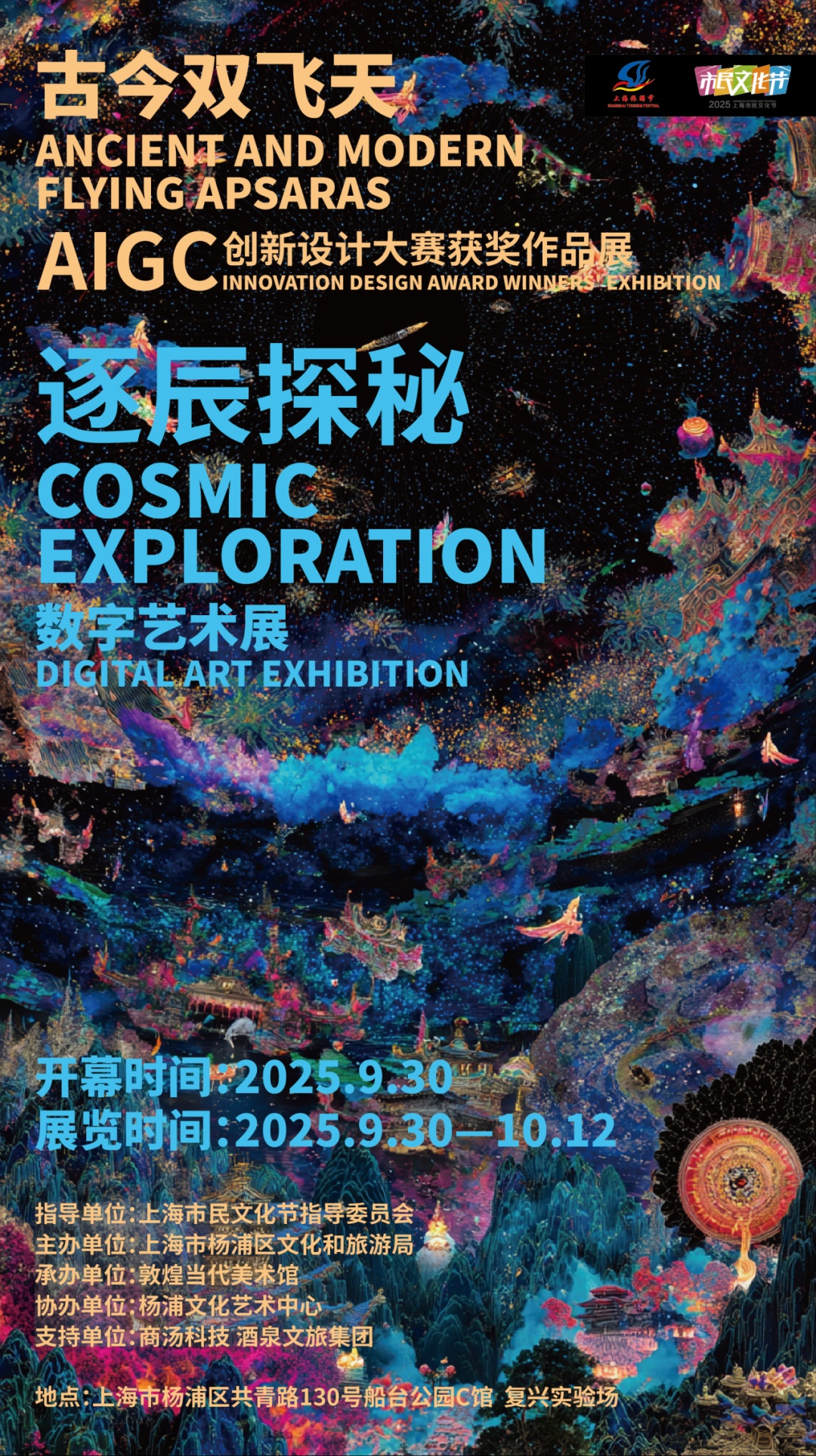 “古今双飞天·AIGC创新设计大赛”是2025上海市市民文化节创新和特色赛事之一。大赛以敦煌、丝路历史、艺术文化与现代航天科技为思考展开创作。展览分三大主题展区“沙粒史诗”“丝路遗韵”“宇宙探索”,旨在通过AI技术的创新应用呈现,探索中国传统美学与当代科技的融合。