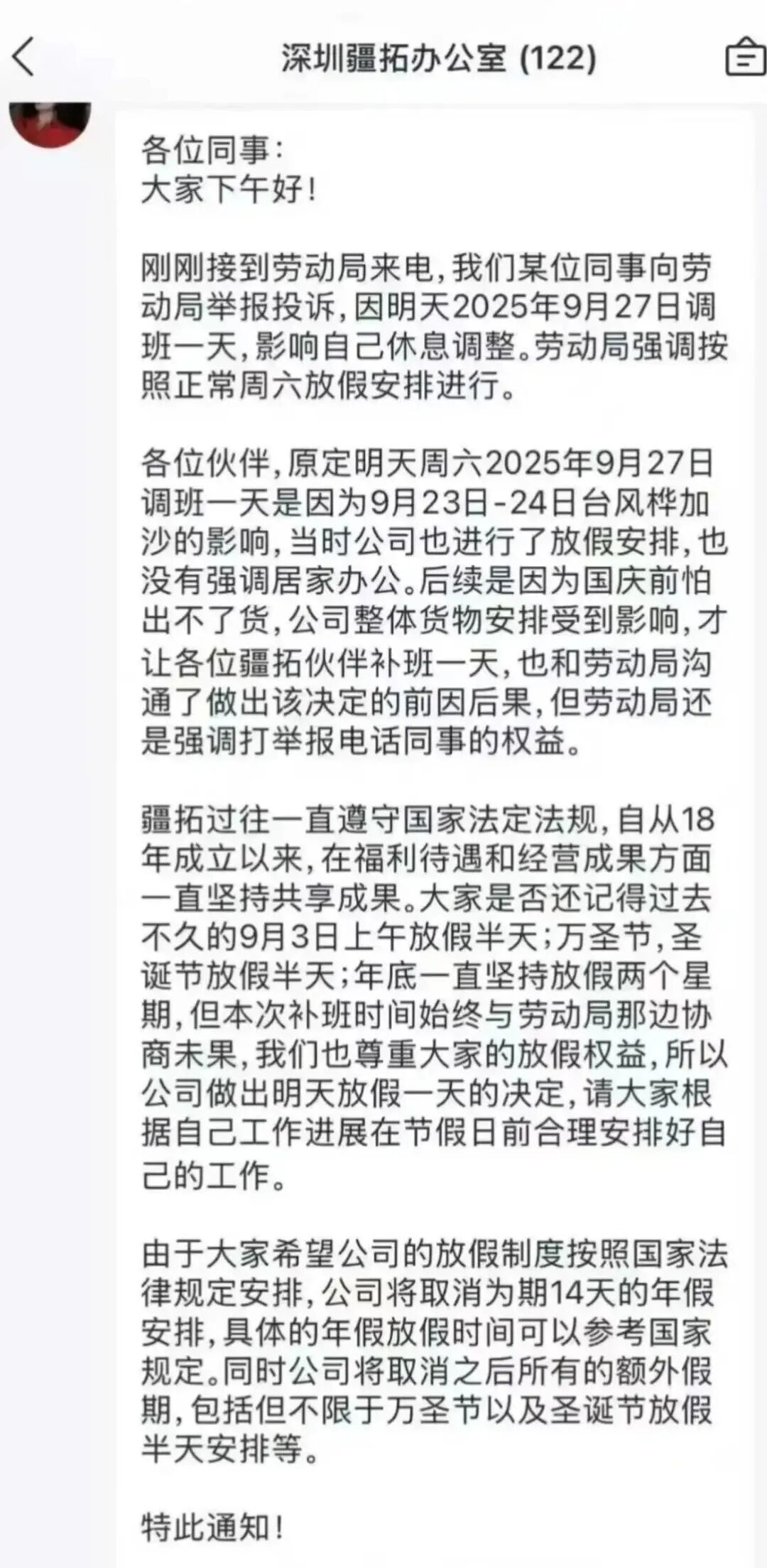 9月27日,该公司发布通知称,经和劳动部门沟通,尊重大家的放假权益,当天(27日)不调班,但将调整公司放假制度,取消员工14天年假福利及所有额外假期。