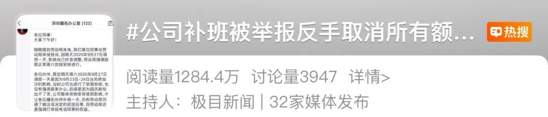 今天上午(9月29日),有媒体报道,针对此次舆情,深圳市疆拓商贸有限公司对事件引发的社会关注和占用公共资源深表歉意。公司表示,在区、街道劳动部门的督促和指导下,已于9月27日(星期六)依法落实正常休息日安排,未实施调班,确保员工当日正常休假。