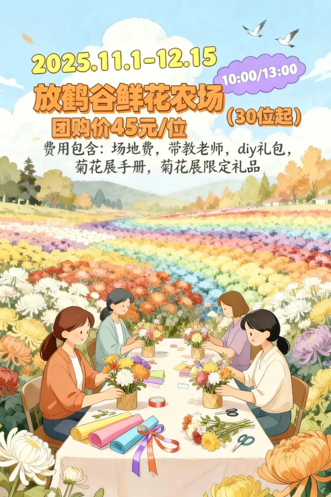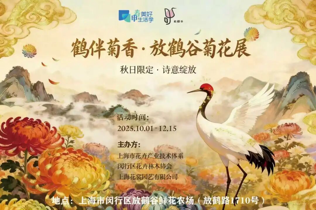 不止赏花 多彩活动乐不停 本次菊花展将配合闵行“春申美好生活季”,从文化艺术、旅游休闲、展览展会等多角度进行串联,助力闵行打造城市级消费与文化盛会。活动时间将从10月延续至12月,其间,放鹤谷还准备了丰富多彩的活动: 鹤伴菊香·放鹤谷菊花展 精品切花菊 10月1日—10月23日 科普和互动 1. 菊花花艺趣味课堂 2. DIY菊花花艺作品 精品成品盆栽菊 11月1日—12月15日 科普和互动 1. 盆栽菊花趣味课堂 2. 自制菊花盆栽 泾彩文创董慧技能大师工作室 菊韵传香·掐丝珐琅画展 11月1日—12月15日 科普和互动 1. 掐丝珐琅趣味课堂 2. 手工文创周边 除此之外,市民朋友可通过参加活动,解锁菊花展特制印章,集齐三款,就可以获得放鹤谷推出的首款文创周边礼品一份。 乐光派对 10月1日—10月8日 每日17:00—21:00 (篝火晚会专属时段19:30—20:30) 月下狂欢6大玩法,解锁中秋新体验 1. 月下放鹤·玉兔寻踪:走进馥郁玫瑰园,寻找藏在花丛间的玉兔摆件。准确报出找到的兔子总数,即可直接兑换中秋限定礼物,趣味与惊喜双重在线。 2. 迷宫通关·解救兔子:专属中秋主题迷宫已上线,一只可爱兔子被困其中。凭借智慧闯过迷宫找到它,解锁“解救达人”称号,收获额外纪念礼。 3.星空光影剧场:暮色降临,银幕亮起,看一场经典影片,光影与月色交织成专属仲秋的浪漫。 4. 篝火晚会狂欢:手握荧光棒随音乐摆动,看烟花在夜空绽放出绚烂火花,把派对氛围推向高潮。 5. 露营观月时光:可自带帐篷免费入驻观月区,与家人朋友围坐帐篷旁,抬头便是皎洁明月。(咨询现场工作人员可了解搭建大帐篷或天幕定制价格) 6. 月下美食盛宴:滋滋冒油的烧烤、清爽解腻的饮品全天供应,用美食填满味蕾,在烟火气中感受中秋的温暖。 快乐团建定制服务 11月1日—12月15日 提供团队半日游、一日游服务,赏菊、科普、DIY手作等多项服务,等您解锁。秋高气爽,与亲朋、好友、同事,一起围炉煮茶、陶冶情操,给心情美美放个假吧~ 咨询电话: 19121923776 放鹤谷客服 18017722365 刘老师 秋日正好,菊香正浓。这个国庆,不妨放下忙碌,带上家人朋友,到吴泾放鹤谷感受这场金色盛宴吧! 交通指南 开放时间:周一至周日9:00—17:00 地址:上海市闵行区放鹤路1710号 地铁:距离轨道交通15号线永德路地铁口1公里、5号线北桥地铁口2.3公里。 公交:距离闵行5路、闵行10路,闵行37路公交站200米;距离180路、闵行4路公交站350米;距闵行7路、闵行18路公交站700米。 自驾:导航搜索“放鹤谷鲜花农场”,谷内停车位有限,入场收取10元/辆入场费(赠送等额10元全场消费代金券) 【温馨提示】请文明观展,爱护花草,勿采摘践踏,花展期间如遇人流较大,可适当错峰。