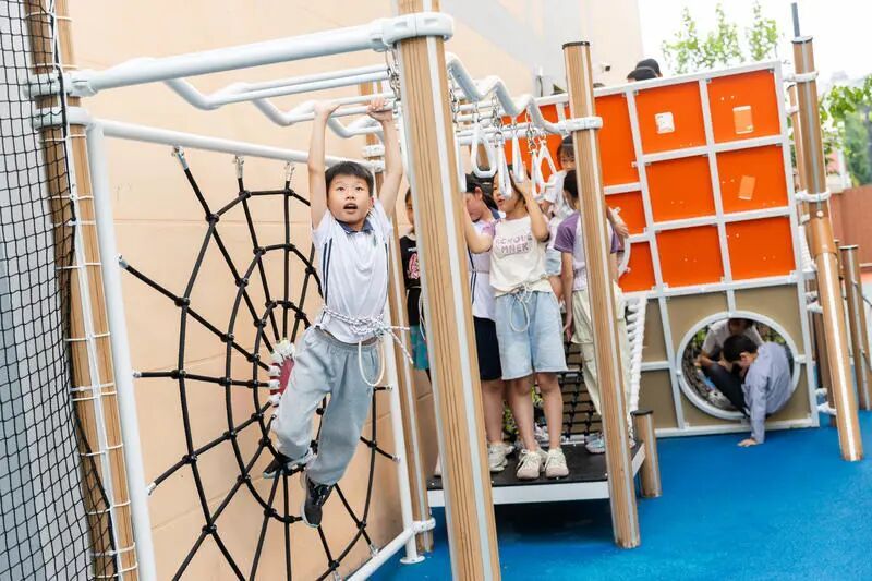 空间延展了,活动的深度如何不断挖掘?学校构建“乐运动”课程体系,形成“基础+拓展+特色”三位一体架构。分年级开设体育活动日:周一篮球日、周二排球日、周三游泳日、周四花样跳绳日、周五网球日。课后服务推行“十选N”校本体育课,学生选学足球、武术、羽毛球、啦啦操等项目,重点打造排球特色,实现“一生多能一专长”。