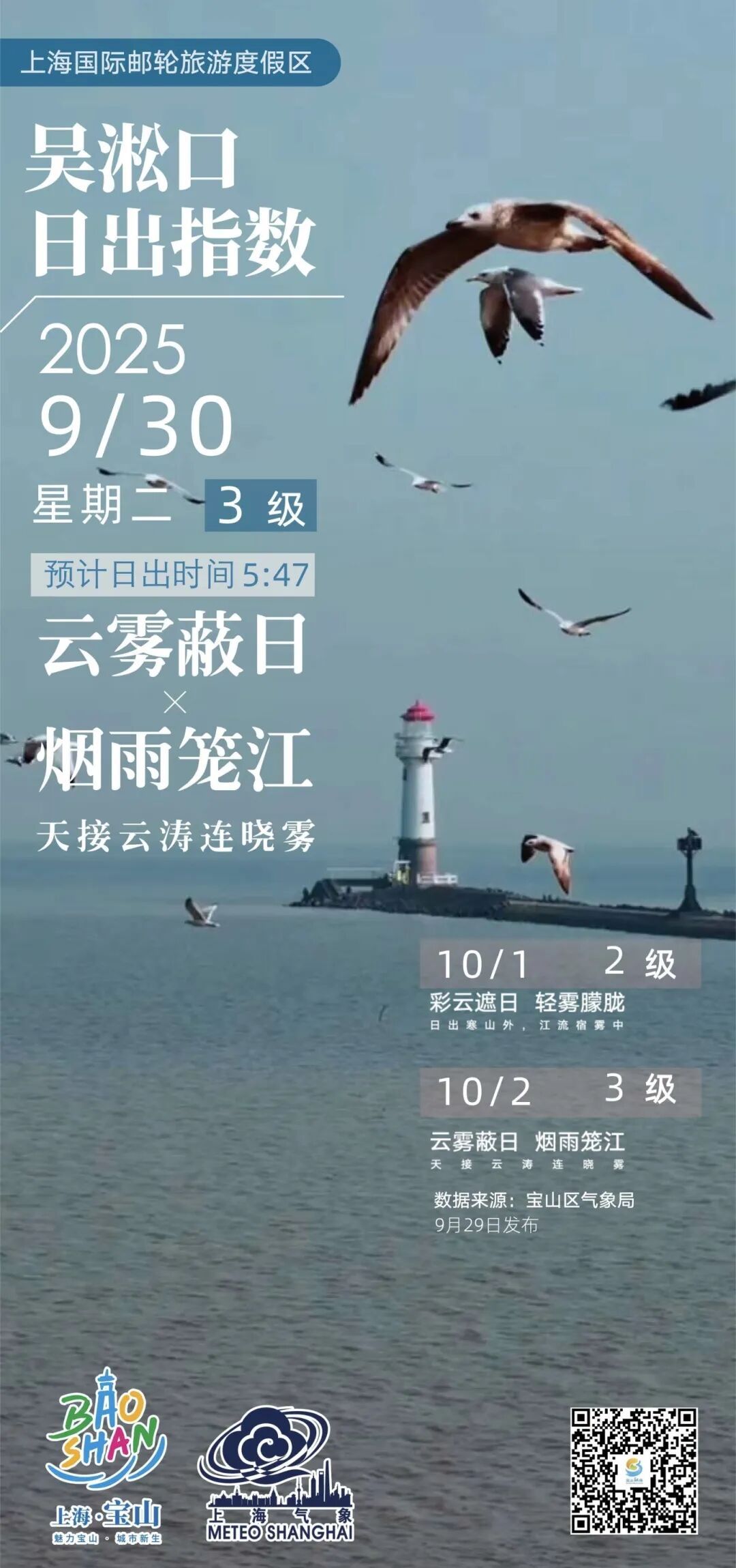 【吴淞口日出指数】9月30日3级 云雾蔽日×烟雨笼江