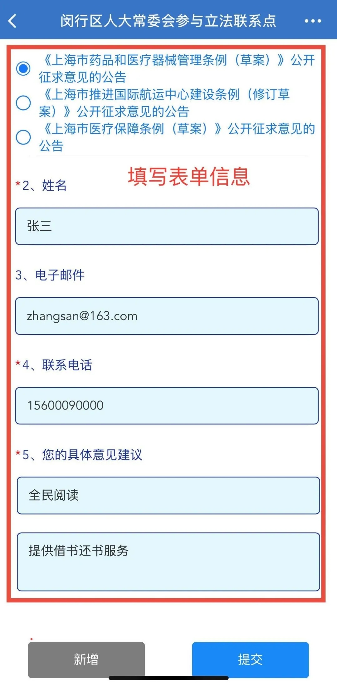 4.选择想要提意见和建议的条例(草案),填写相关内容(具体意见建议一栏注明第X条或者其他建议);