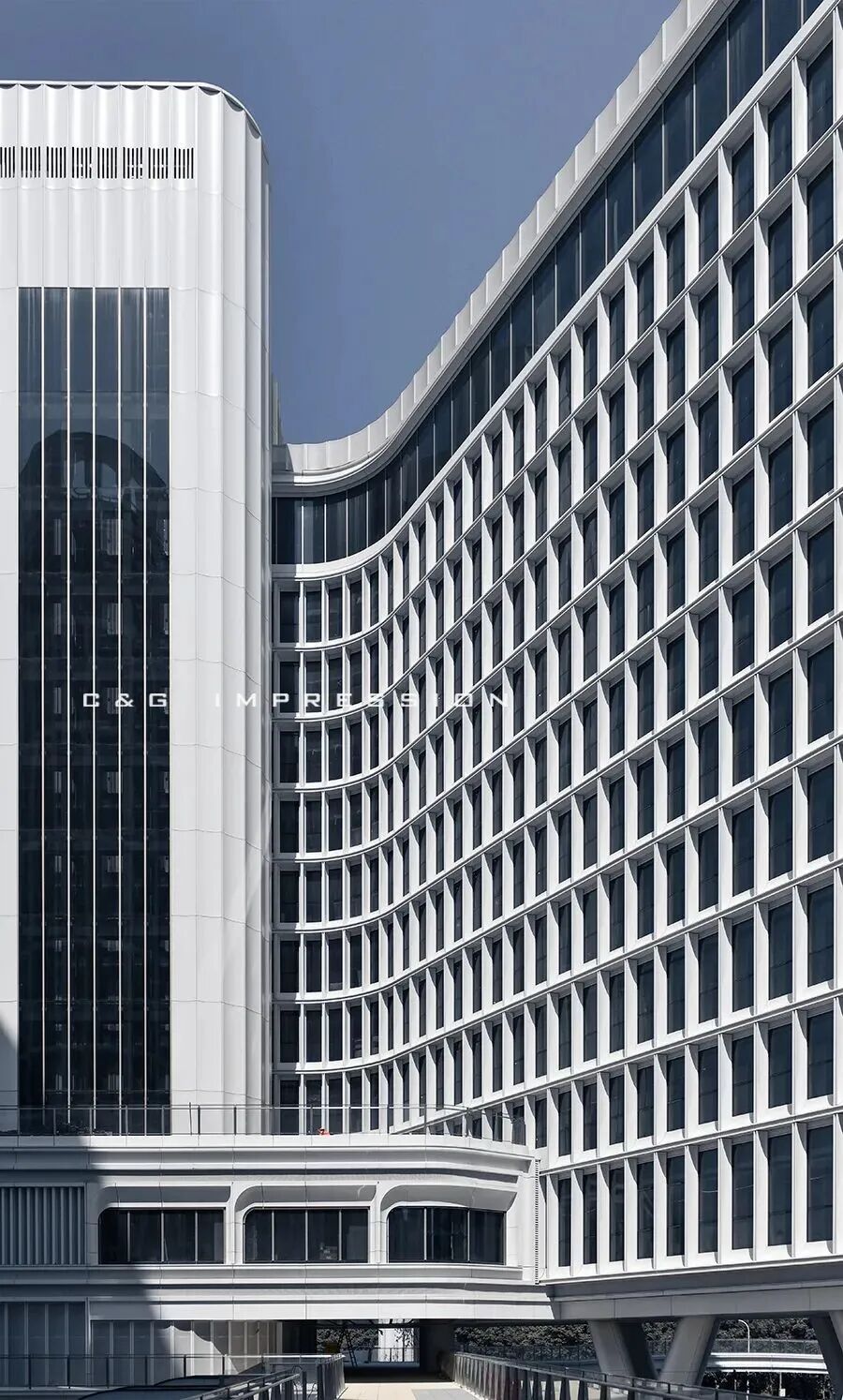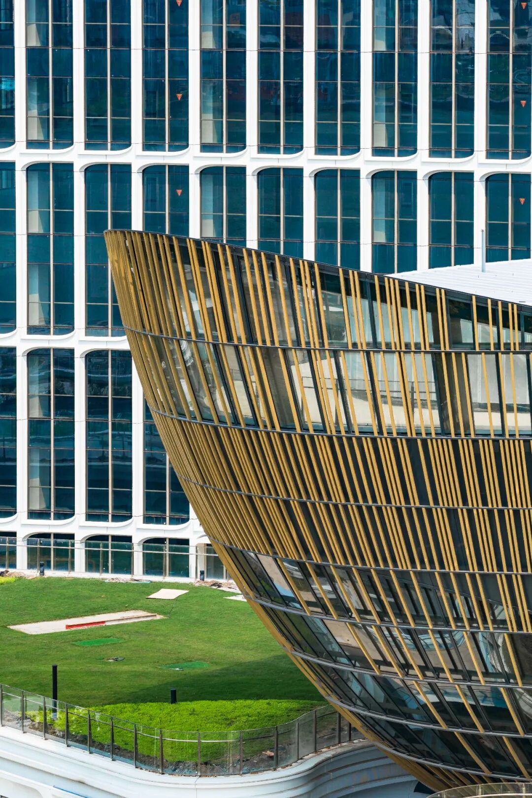 与竖向的玻璃幕墙相结合,