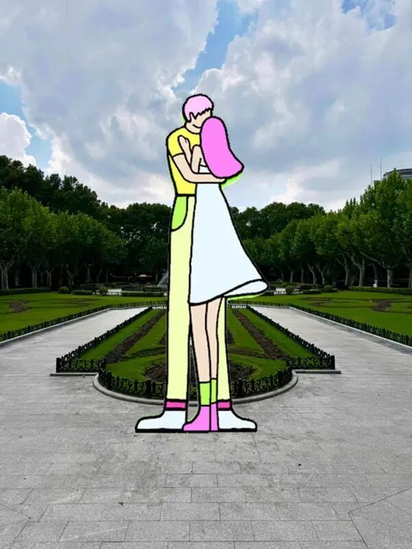 “拥抱”雕塑作品,以“打破次元壁”为核心概念,构建连接二次元与三次元、传统与潮流的艺术符号。从布朗库西的极简抽象到凯斯·哈林的手绘涂鸦,拥抱始终是艺术史中跨越文化的母题。HUG雕塑以当代视觉语言重释这一主题,让雕塑成为城市中的情感枢纽——无论时代如何改变,人与人之间的联结永远是都市最温暖的底色。同时,雕塑中荧光色彩与粗黑框线的碰撞,既呼应着INS风格的视觉潮流,亦是对漫画美术史中“线条赋予情感生命”的致敬。