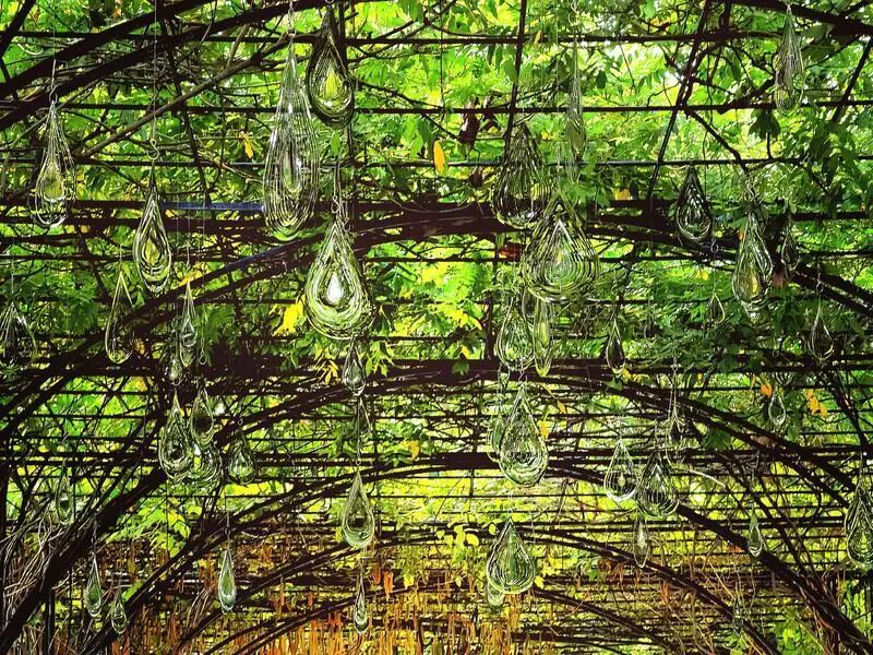 复兴公园的紫藤廊架是李中伟最喜欢的场景,满眼青翠、静谧清幽,亦含悠扬的灵动与活力。他希望能够在这个美的场景中,通过“轻介入”创作一组美的作品,让大家喜欢,他认为“喜欢”是作品创作最大的意义和动力。李中伟曾在2025上海国际花展中创作了“鸢尾咖啡馆”这组作品,Iris既是鸢尾也是眼睛的虹膜。花展期间,这组“眼睛”造型的灵动艺术作品,受到观众喜爱,成为花展最热门的网红打卡点之一。本次艺术季中,根据场景特质,他在复兴公园创作了这组“雨”,将“鸢尾咖啡馆”设计灵感加以延续,并为其注入新的价值和表达,带来新的生命力。
