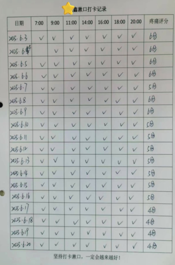 疼痛的阴影如影随形。我设计了一份疼痛-漱口动态记录表,忠实记录他“疼痛故事”的每一次起伏,及时反馈医生调整止痛方案。准时送上止痛药、漱口液中加入局麻成分、偶尔的冷敷……我尝试着各种“止痛的语言”,只求为他疲惫的心注入片刻安宁。