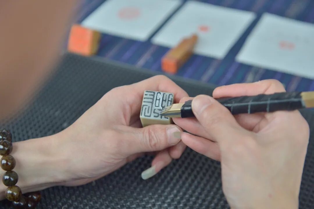 上海书法家协会会员、中华书画协会会员吴栋根,上海市书法家协会会员、普陀区书法家协会副秘书长谈洪现场展示从起稿、修改、上印、覆写、初钤、复改到完稿的印章篆刻过程。