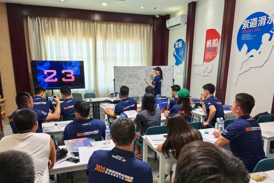为保障赛事执裁的专业性与一致性,赛事组委会于10月6日至7日组织了赛前裁判培训。国际裁判邓佩珊为裁判团队系统讲解了国际滑水联合会(IWWF)的最新赛制规则,并分享了执裁经验。她表示:“参与培训的裁判都具备丰富经验,此次重点在于更新系统规则,重温打分技巧。”培训内容围绕IWWF赛制系统展开,确保裁判与工作人员全面掌握规则要点与岗位职责,保障赛事顺畅进行。