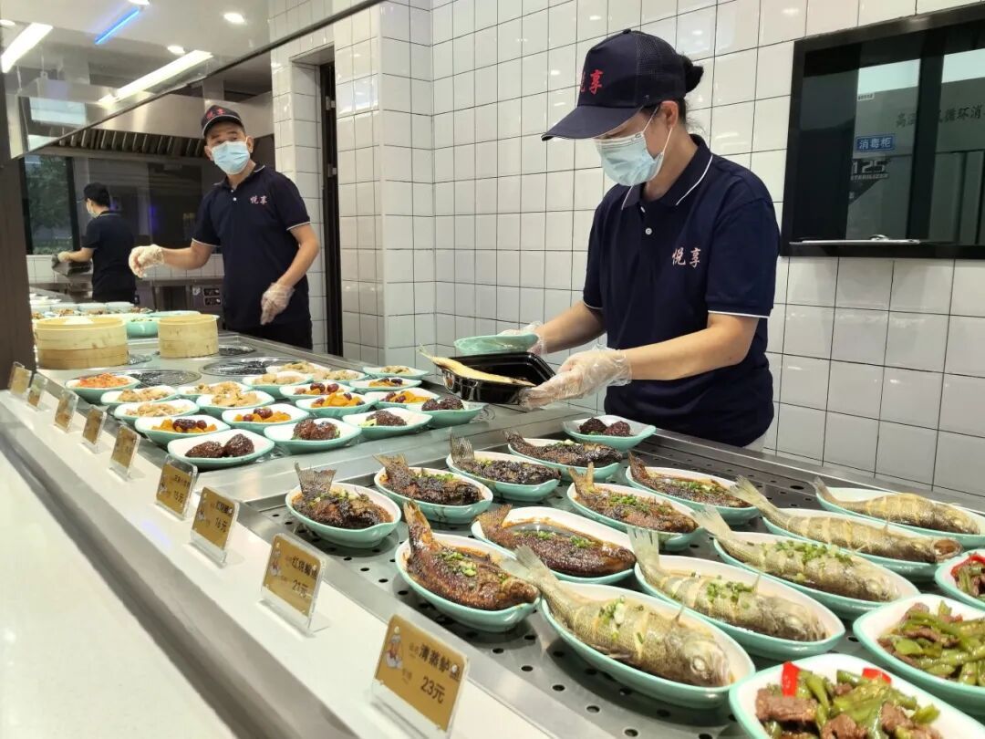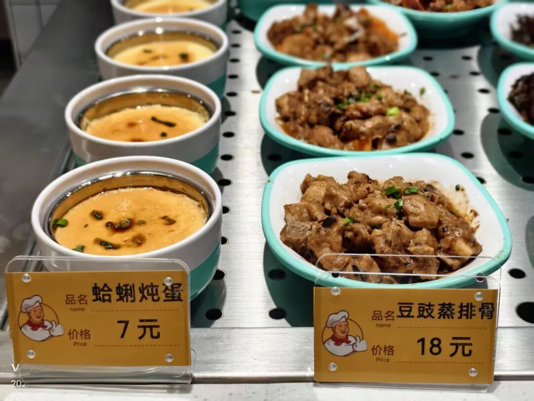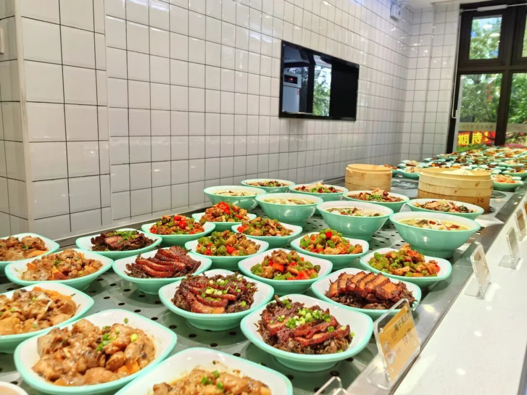 供餐区,当天供应的餐品已摆放齐整,丰富多样且价格亲民,红烧狮子头、宫保鸡丁、清蒸鲈鱼、时令鲜蔬等各类家常菜琳琅满目,餐品均为当日现炒,不仅色香味俱佳,而且营养均衡,能很好地满足居民多样化的用餐需求。